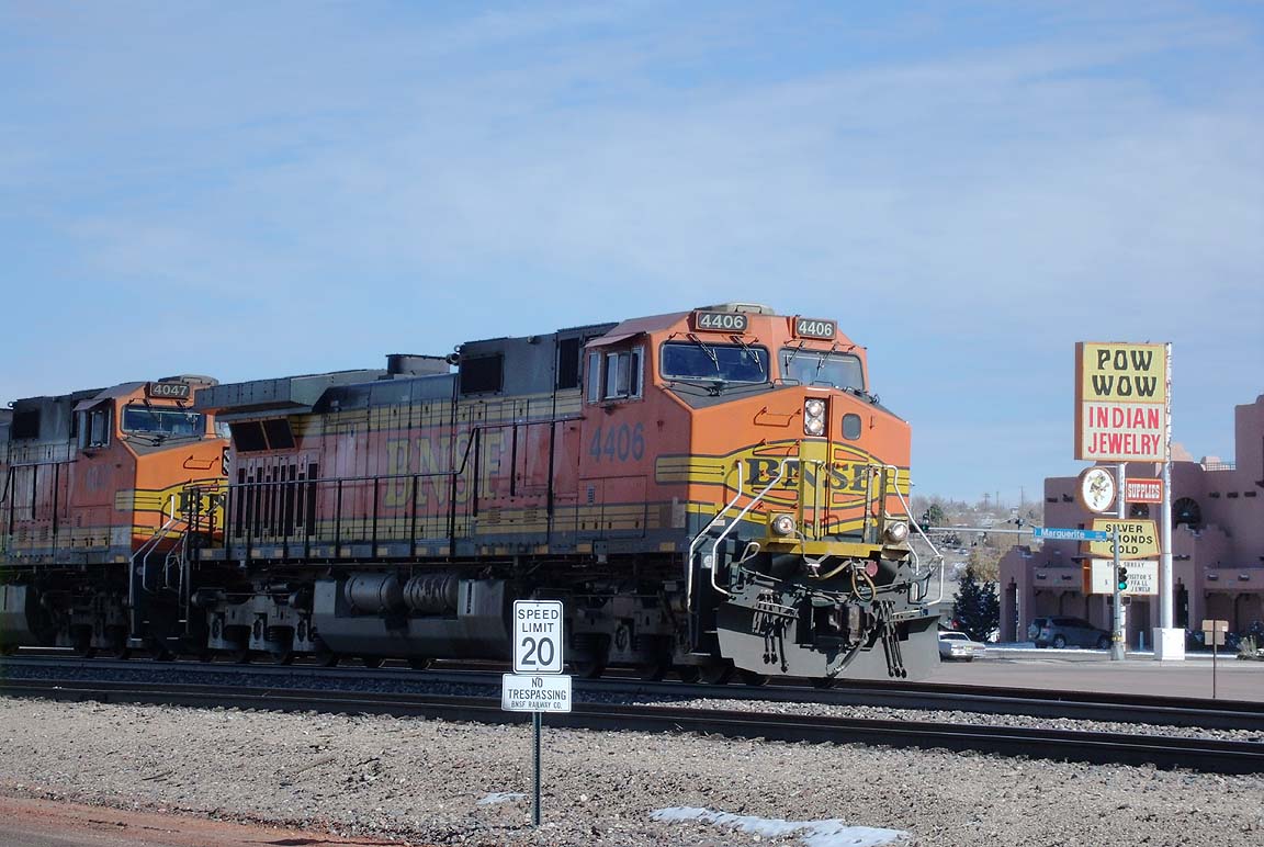 No. 4406 is on the point of a westbound freight at Gallup on 2/21/2011. The sign in the background is a quintessential Route 66 motif… |