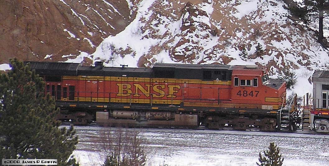 No. 4847, two views: TOP: Shoving on the rear of a westbound freight at Coal Creek Canyon, CO.BOTTOM: Same train, approaching Pinecliffe, CO on 12/5/2008.Built August 1998. |