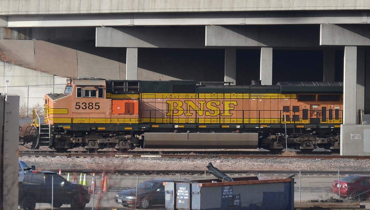 No. 5385 is on a Cheyenne-bound freight as it curls out of the yard and onto the Front Range sub in downtown Denver, 12/16/2014. Most of the units of this series are now extremely faded. Built November 2000. |