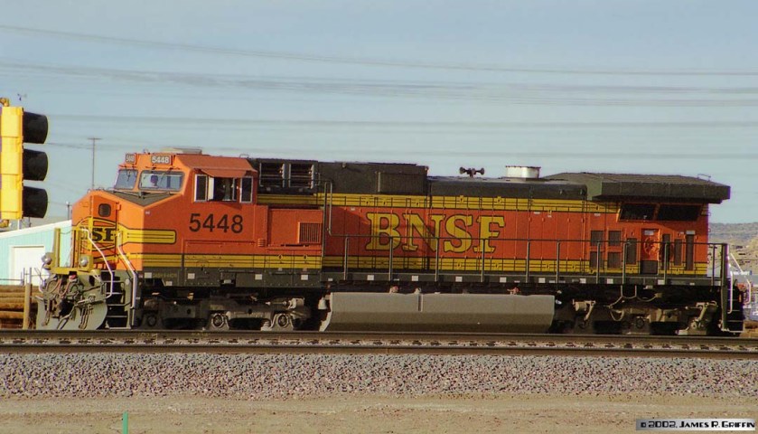 No. 5448, at west Gallup on 1/26/2002. In this shot it was being moved around the yard by itself; I never did see why. (Pardon the traffic light in the image…) We liked it because it matched our phone number at the time! |