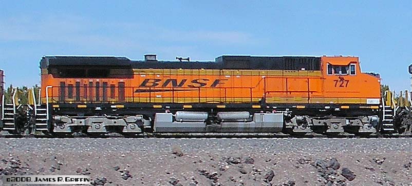 No. 727, in New Image paint, east of Flagstaff on 3/27/2008.Note the six steps up to the pilot deck. The earlier versions delivered to the Santa Fe had only five.This unit delivered July 1997. |