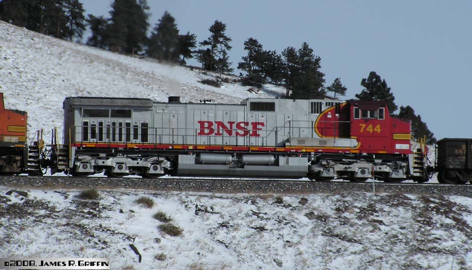 No. 744, at Coal Creek Canyon, CO (on the former D&RGW) on 12/5/2008.Built August 1997 (two years after formation of BNSF). |