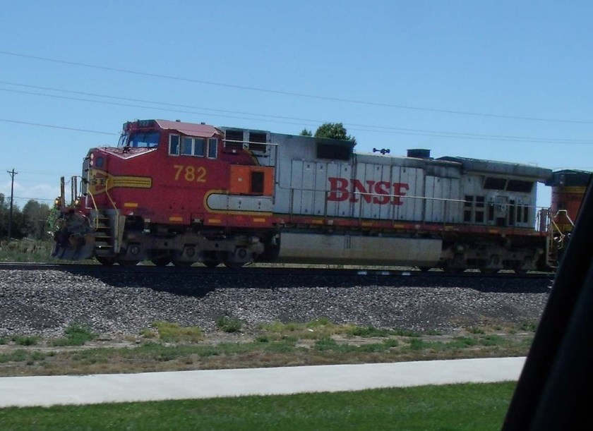 No. 782, rolling northbound into Longmont, CO on 7/31/2012. This is one of those over-the-shoulder shots you squeeze off while in traffic. The train got to the crossing before us, making a properly-lit view impossible. Built September 1997. |