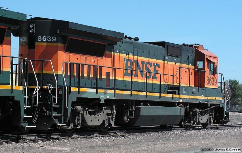 B40-8 No. 8639. Painted in the H1 scheme, it is paired with No. 8604 serving as the Longmont switcher (8/31/2008). It looks like some kind of spill has faded the sill paint over the rear truck. Originally ATSF 7449 (built April 1989). |