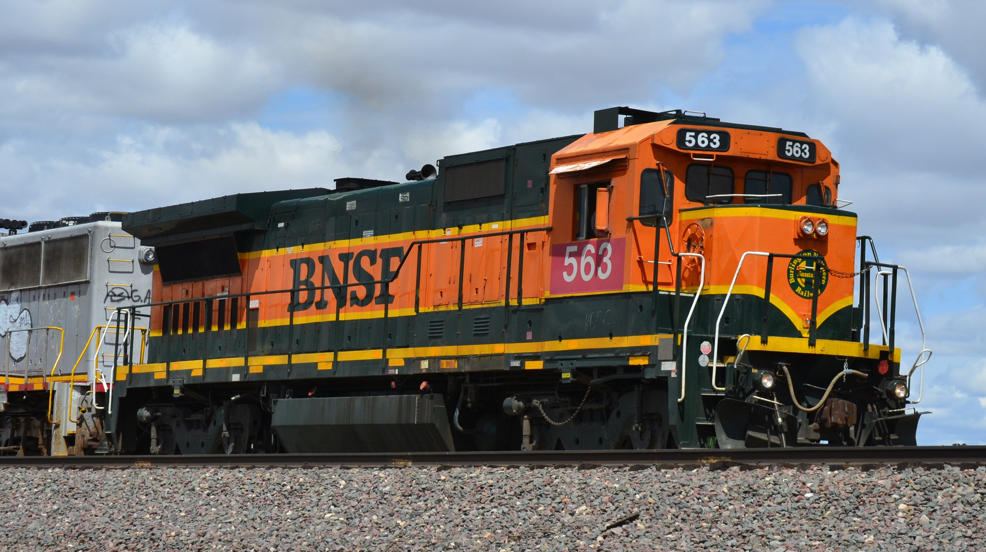 B40-8 No. 563. This is not the original B40-8W bought by Santa Fe; this is a standard-cab rebuild given this number later. Here it’s on the Gallup local on 4/27/2016. |