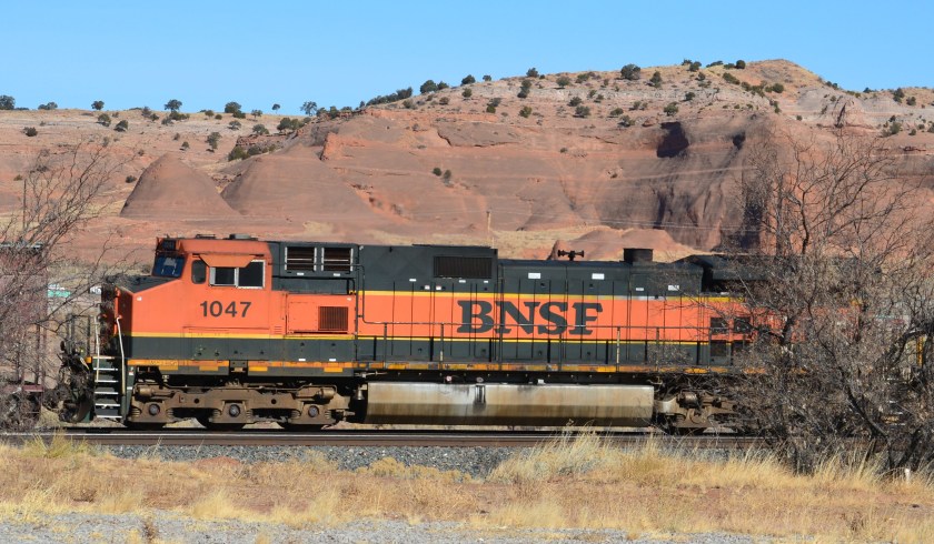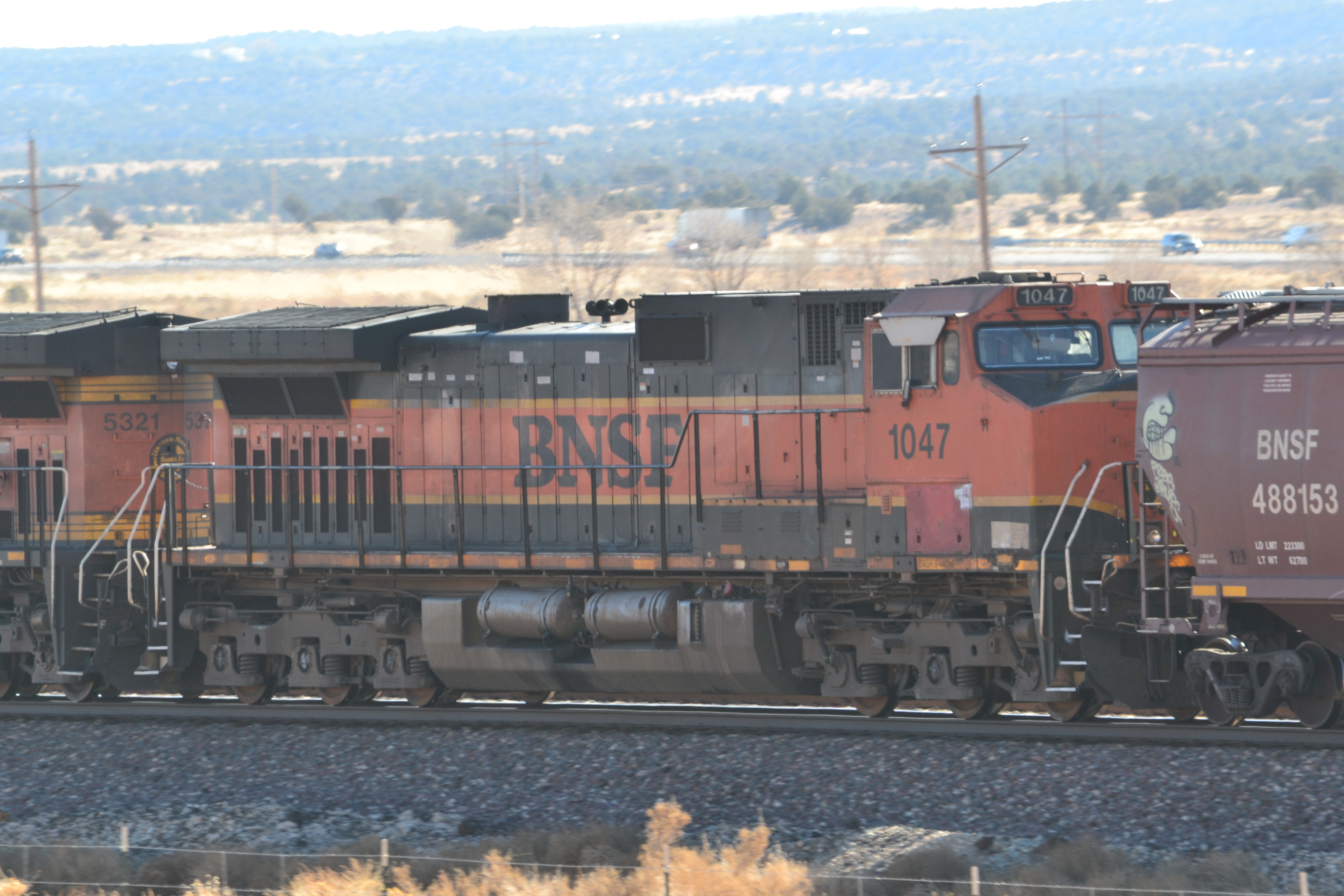 No. 1047, both sides, running as a remote on a westbound freight at Perea and East Gallup, 12/27/2017.Built November 1996. |