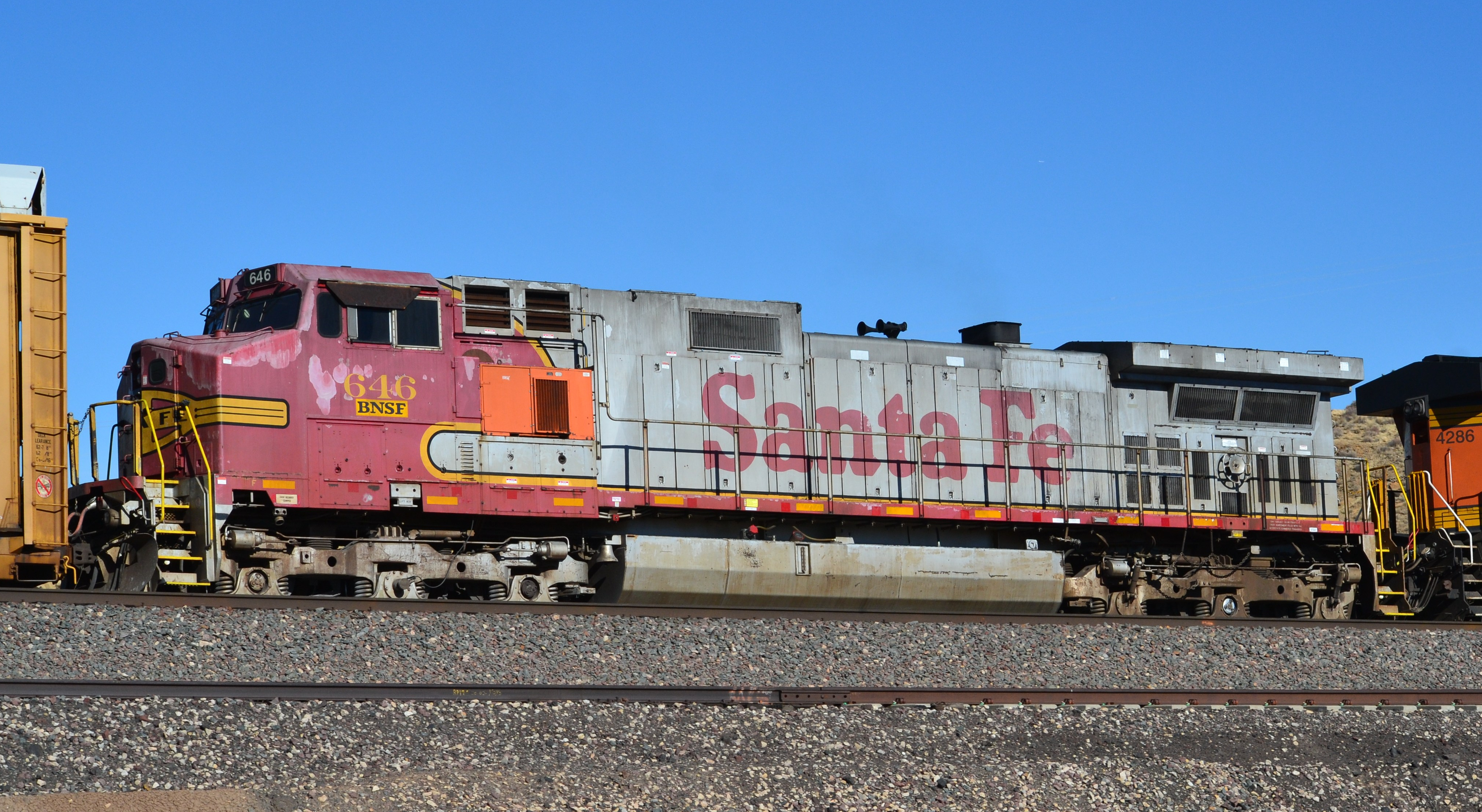 No. 646, still in ATSF paint, coming into Gallup with an eastbound autorack train on 12/27/2017.Built March 1994. |