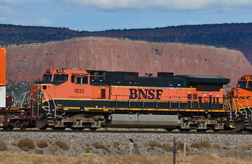 No. 1033 was the trailing unit on an eastbound stacker near Coolidge, NM on 10/31/2021.Built October 1996 and starting to turn a bit salmon-colored at age 25. NEW PHOTO |