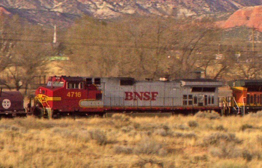 Here’s No. 4716 in its original paint, in a grab shot at Thoreau in April 2000. Part of a very small group of units (4700-4719) delivered in Warbonnet, or “fauxbonnet” paint. |