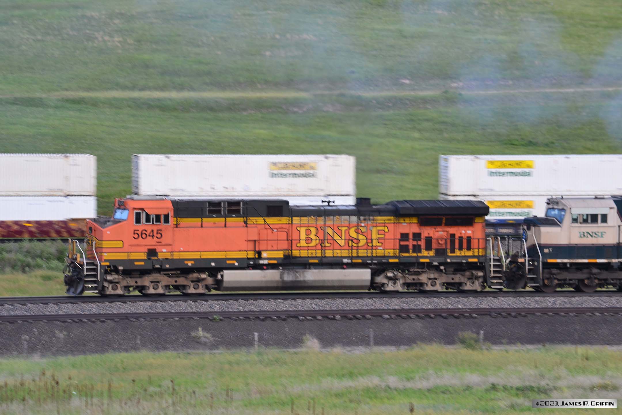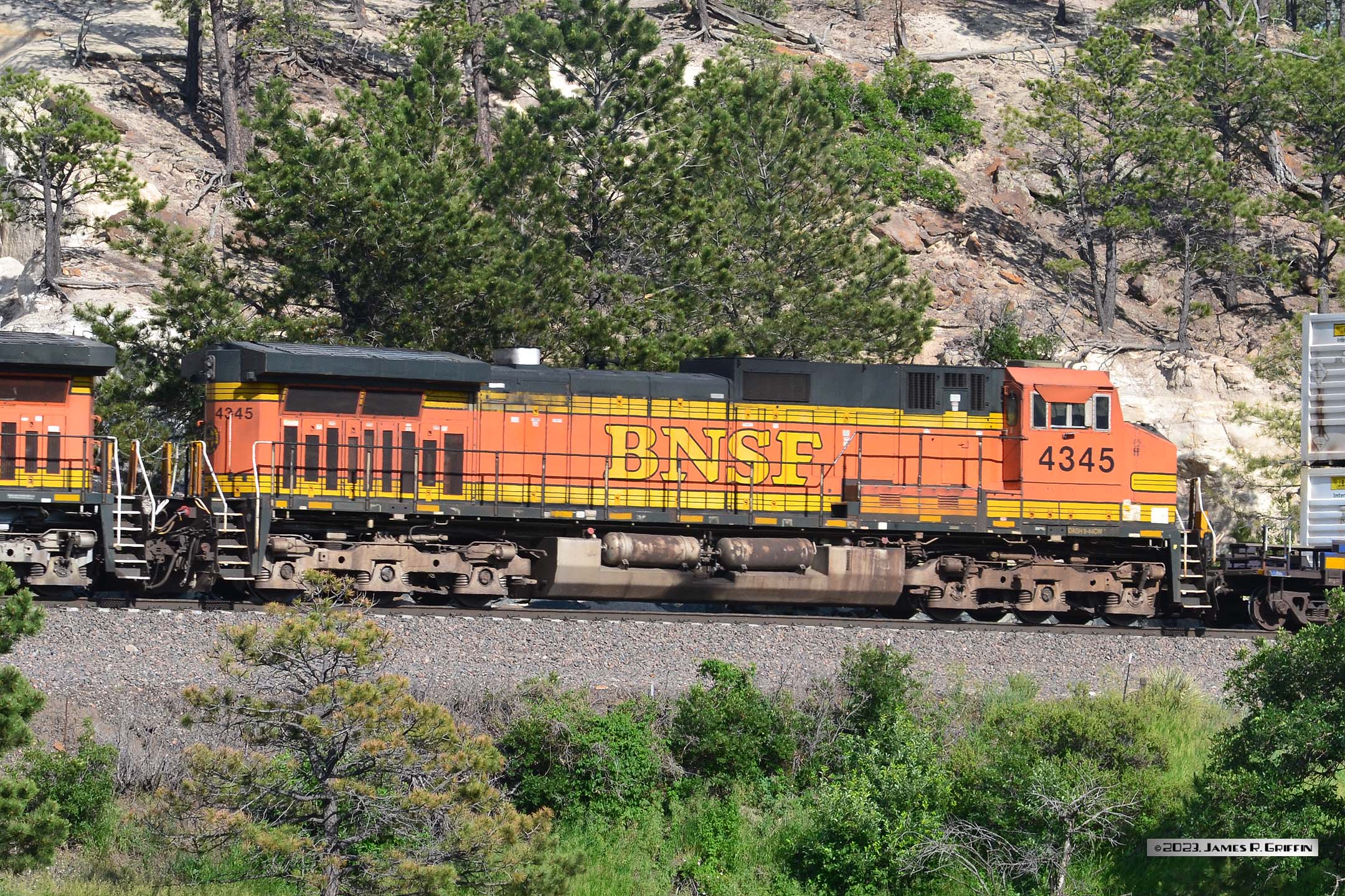 No. 4345 is fourth on a mixed stack/freight train on Colorado’s Joint Line on 7/02/2023. She looks pretty good for a 24-year-old lady. Built February 1999. NEW IMAGE |
