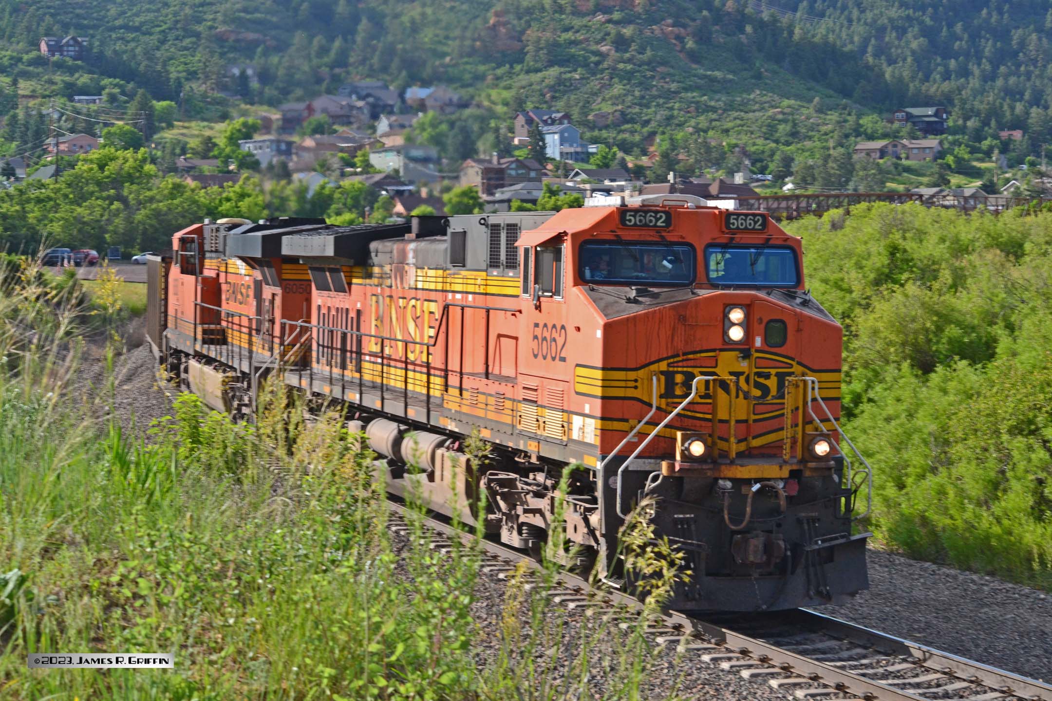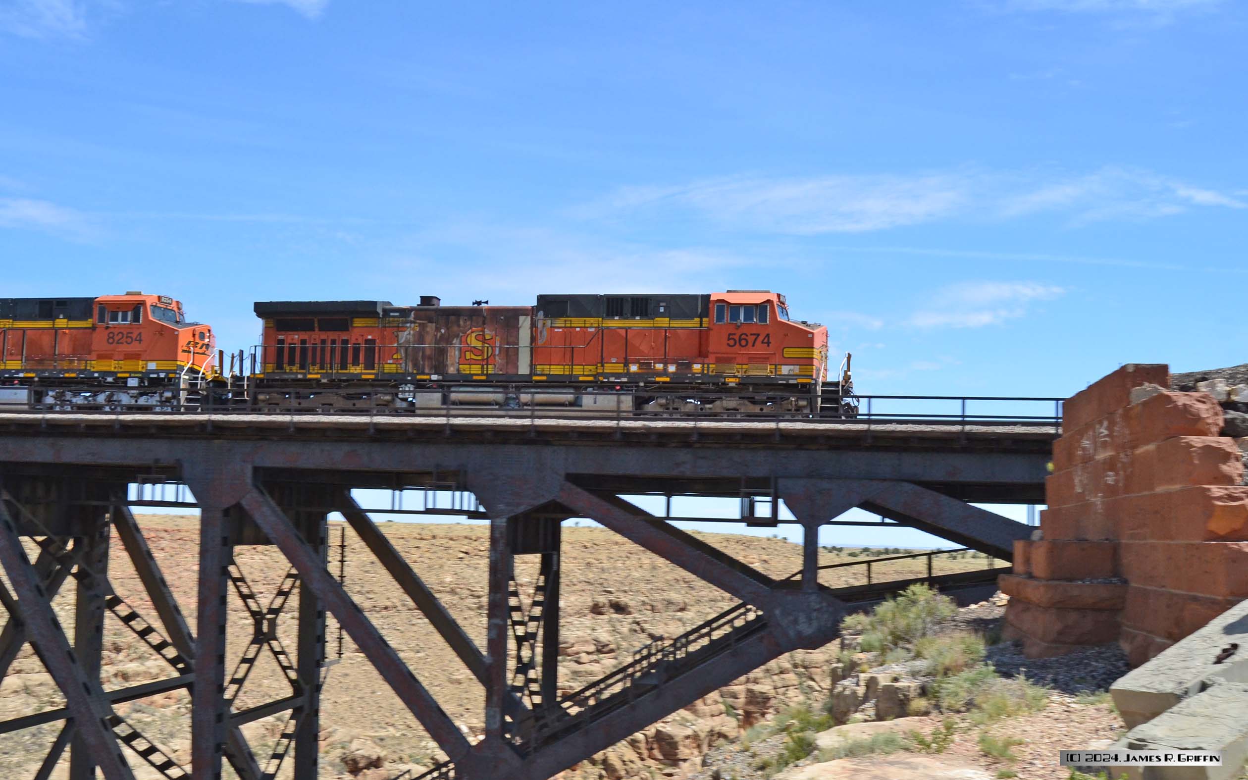 AC44CW No. 5674 is leading a fast doublestack train across Canyon Diablo on August 5th 2024. Mechanically it’s working fine but the body has taken a scorching from exhaust fires… Based on other web photos it’s had more than one such event. Built March 2004. NEW IMAGE |