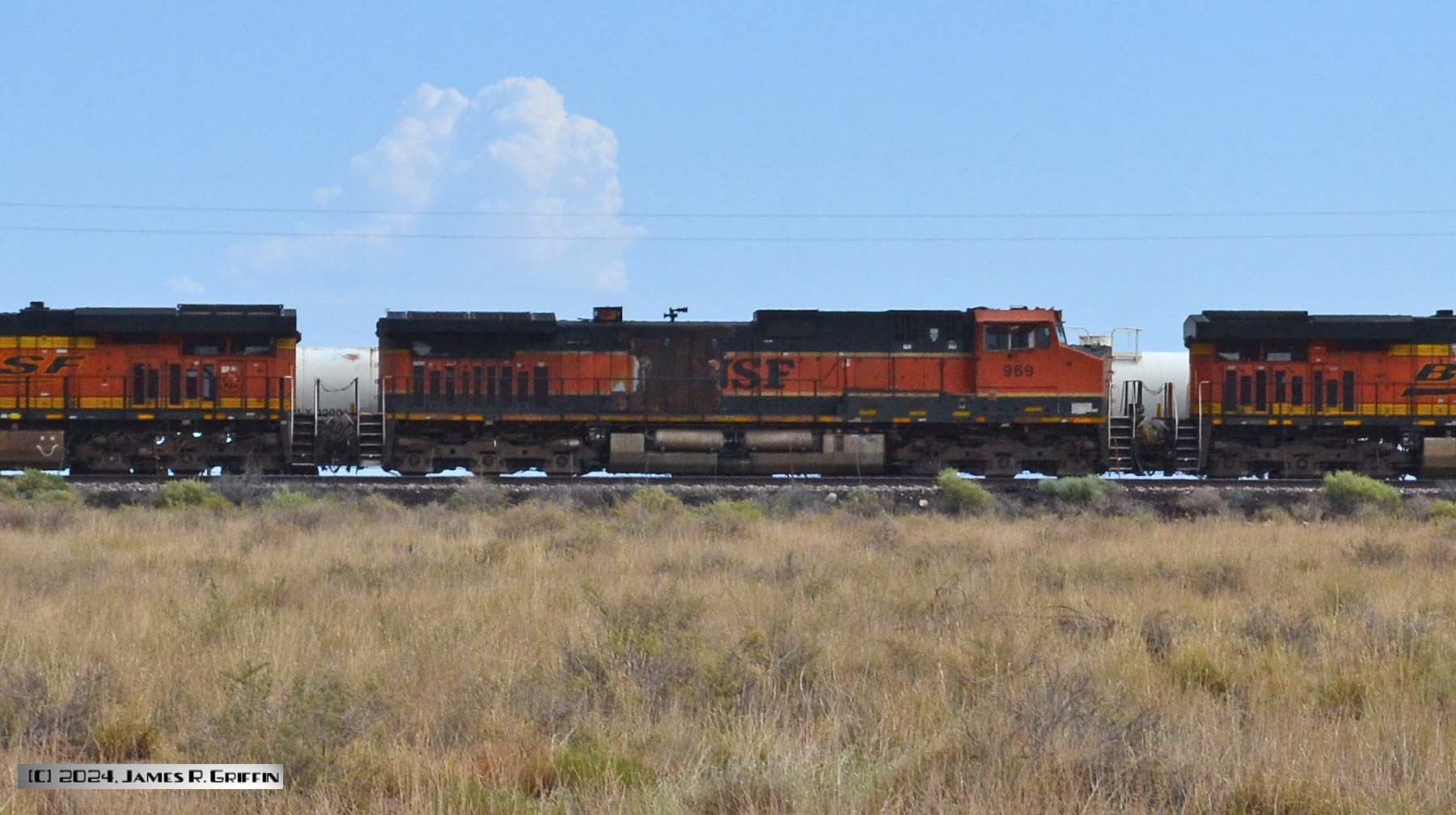 No. 969 is flying eastbound after crossing Canyon Diablo on August 5, 2024. Built August 1996, that makes it 28 years old. It has the usual GE “toaster” burn scars on the carbody, but it was still great to see an H1 in 2024. NEW IMAGE |