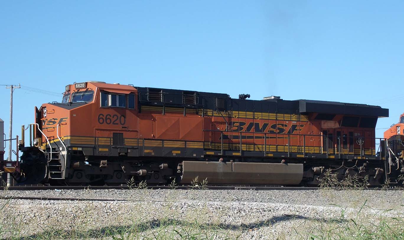 ES44C4 No. 6620 trails on a freight rolling eastbound through Springfield, MO on 9/03/2013. The C4 series of AC-traction locomotives is a hi-tech, A1A-A1A design with many enhanced features. To date BNSF is the only customer. Delivered March 2009. |