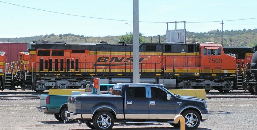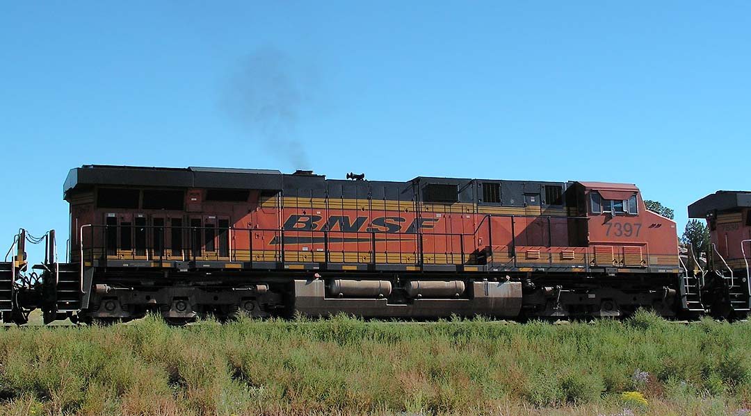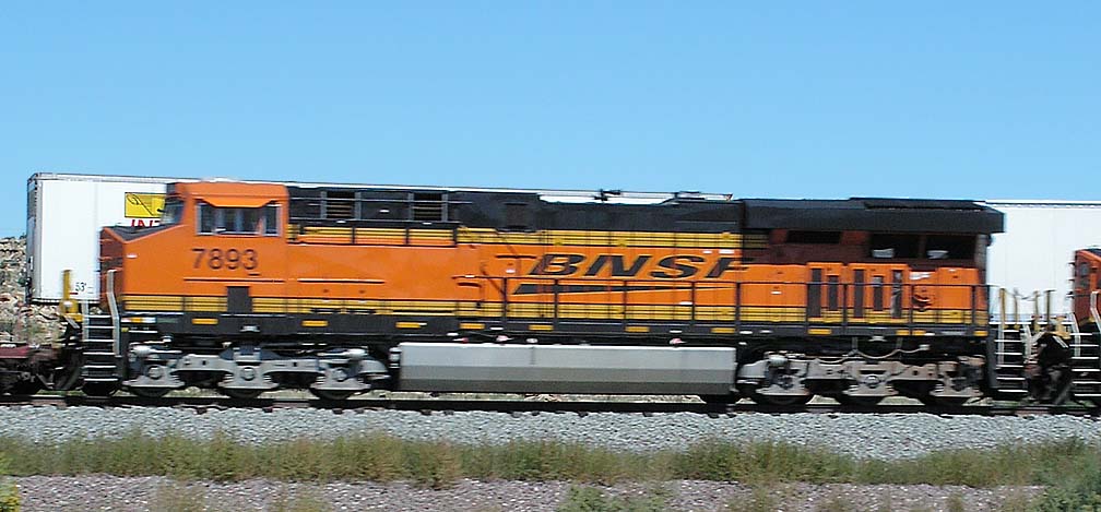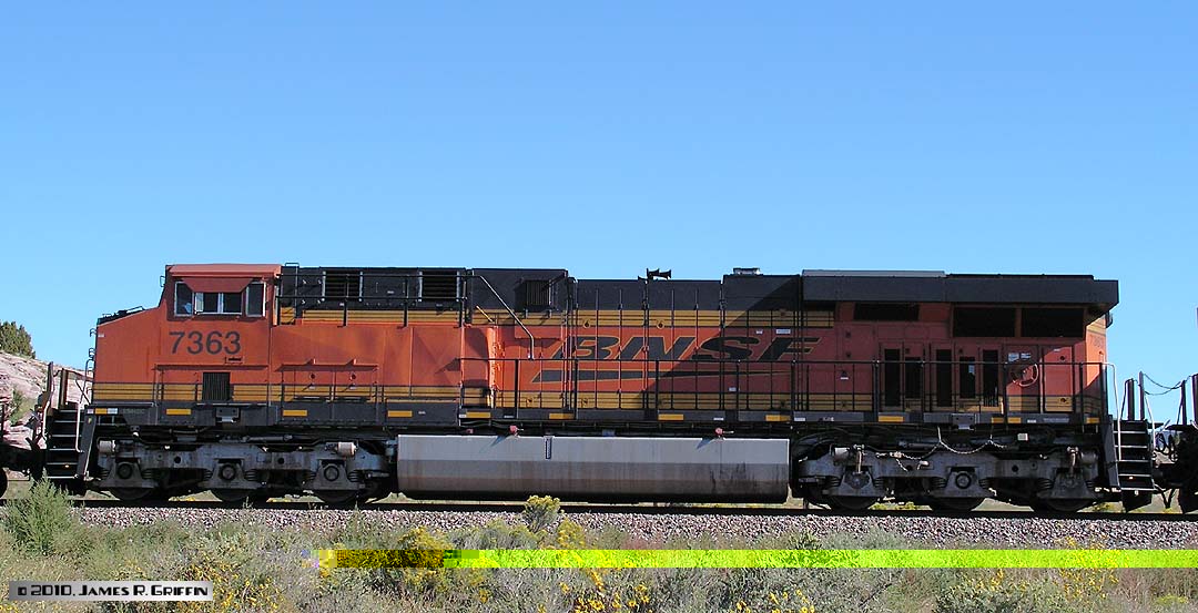 No. 7397 is on an eastbound intermodal near Perea, NM on 9/11/2010. Here it’s actually stopped, waiting for Amtrak train No. 4 to clear.Built May 2008. |