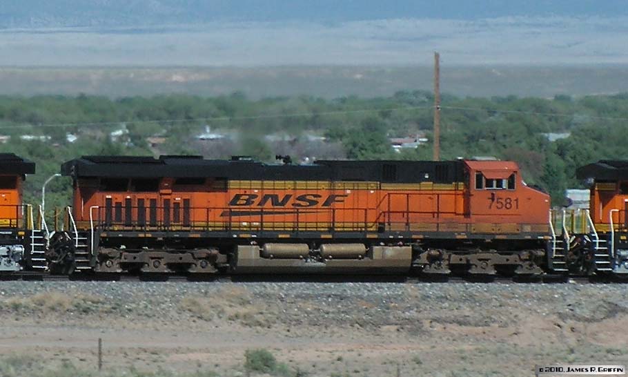 No. 7581, leaving Belen, NM with a stack train on 5/09/2010. This is one of the dirtier BNSF units I’ve photographed.Built June 2007. |