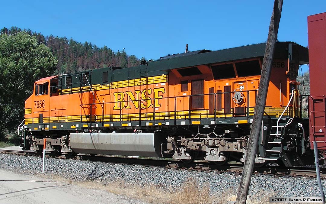 No. 7656 at Sulphur, CO on 8/09/2007. It was delivered in January 2005, and thus barely missed being painted in the Wedge scheme. It has ladders on the end of the long hood, on the middle left, and also forward behind the cab. This also is a good look at the modified radiator setup. |