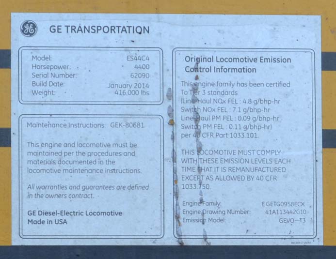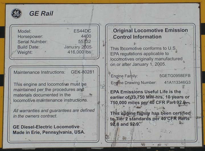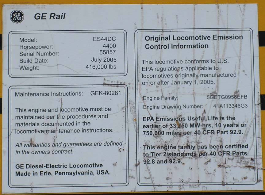 Resplendent and shiny, ES44C4 No. 8016 is only 3 months old in this perfect roster shot. In Grand Junction on 4/27/2014.Here is the builder’s plate. |