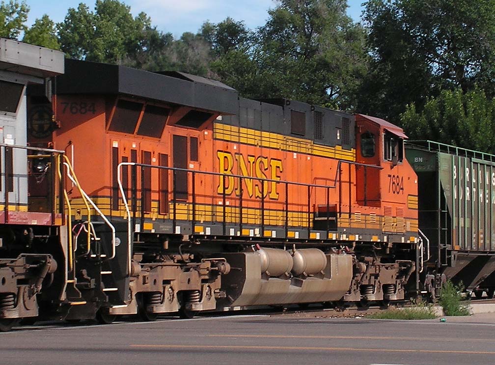 No. 7684 is the trailing unit (of three) on a southbound freight at Longmont on 7/31/2010. Note the H2 paint scheme. Built February 2005. Note that the engineer’s side of these units has no ladders. |