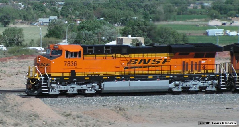 No. 7836, leaving Belen, NM with a stack train on 5/09/2010. Built in March 2010, it’s certainly clean-looking at the 2-month mark. |