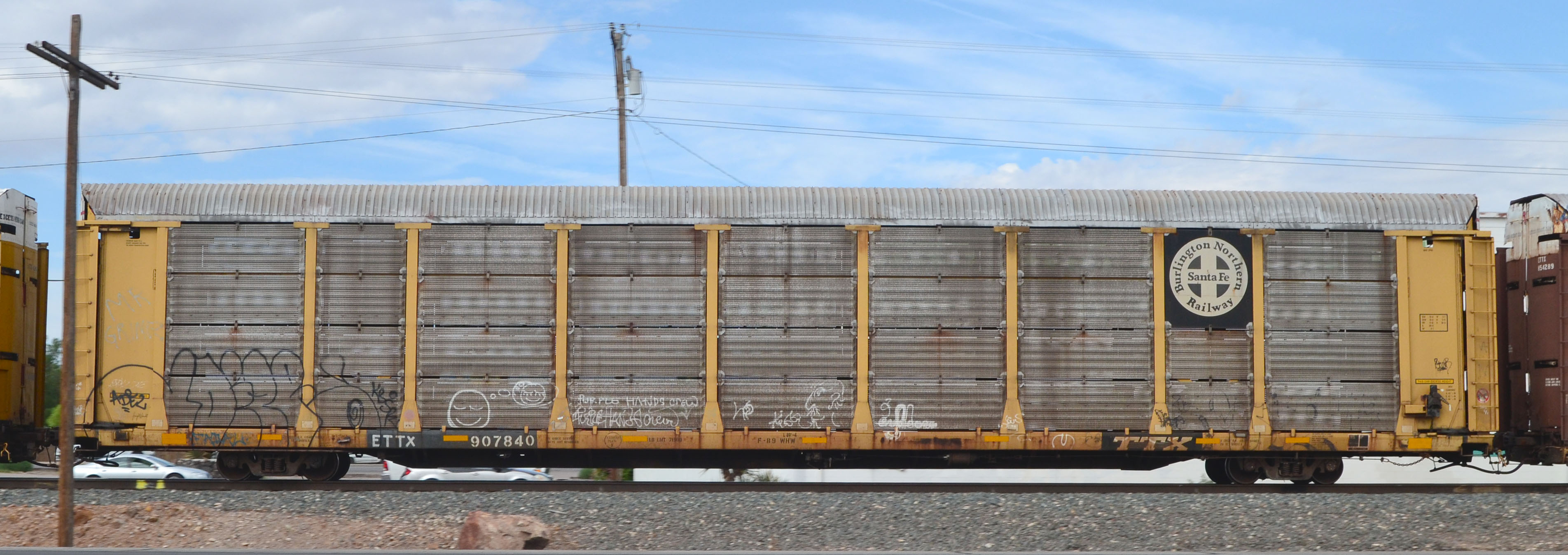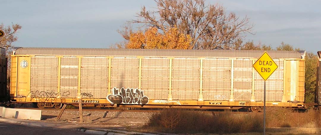 BNSF tri-level auto rack, riding on ETTX flatcar 711097. It’s on a westbound BNSF train at Belen, 10/30/2009. Original merger logo applied to one end only, with no separate herald panel. |