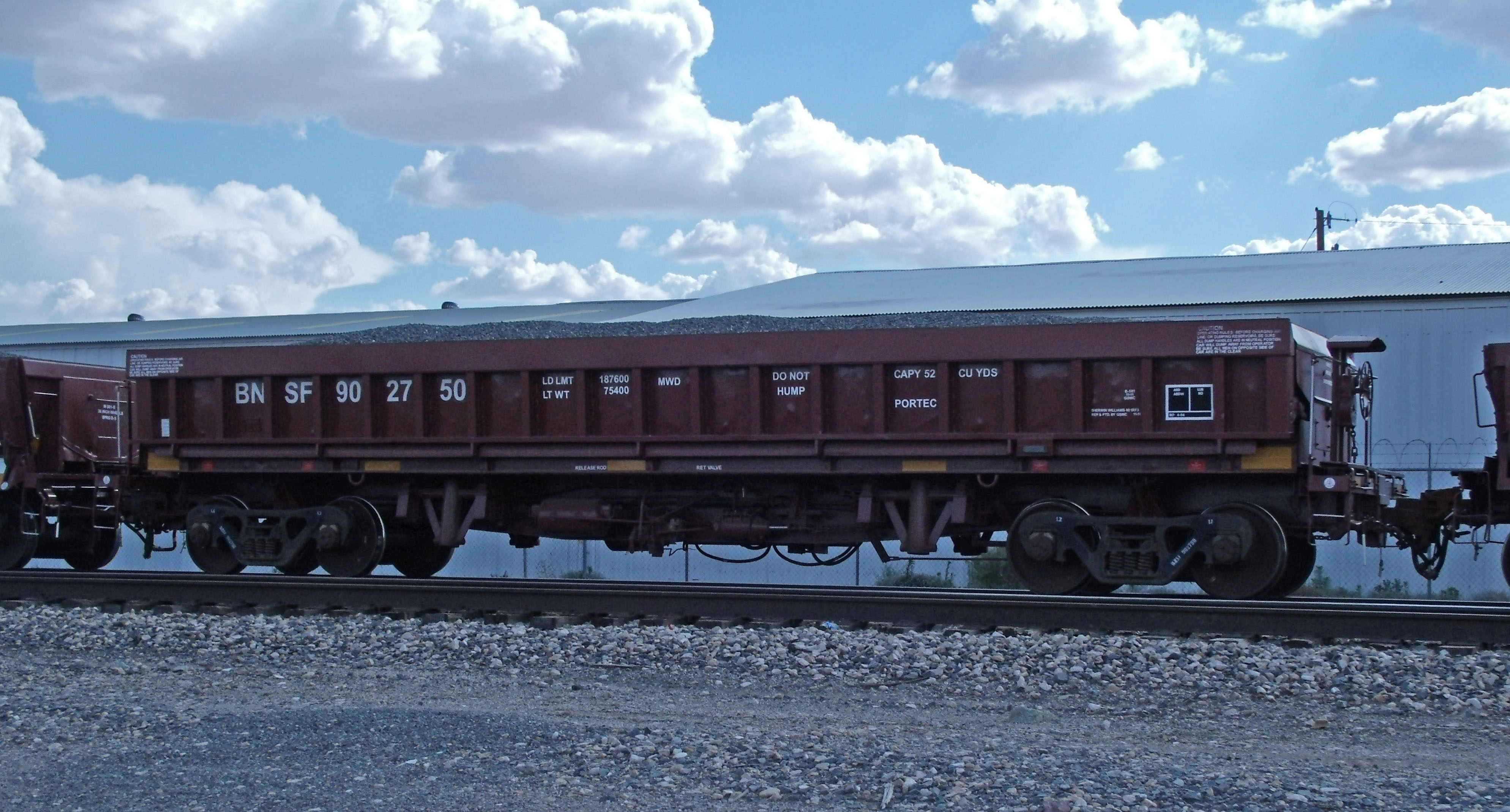 Coil steel car, northbound in Las Cruces on 8/15/2010. The number is unreadable. Note that this is not a deep mill gon but essentially a reinforced flatcar with a cover |
