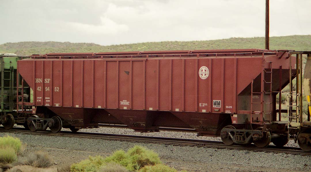 A Santa Fe 3-bay ACF covered hopper, No. 313809, is spotted at Rincon on 5/09.2010. Still in its original paint scheme some 15 years after the merger, it’s looking good. |