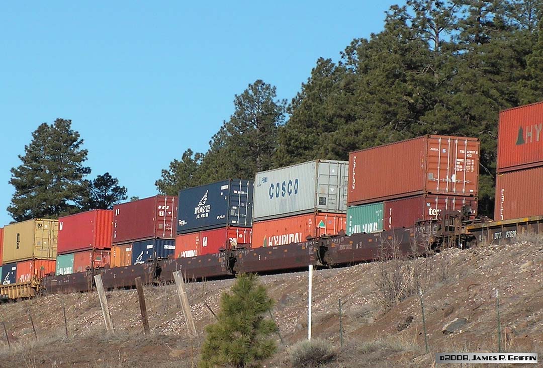 5-unit well car for doublestacks. Number not legible in the photo, but definitely BNSF reporting marks. Eastbound near Flagstaff (3/27/2008). |