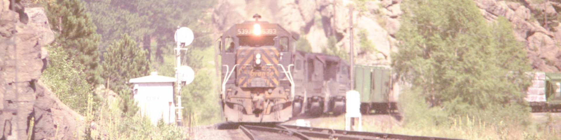 Open gondola 516458 and another unidentifiable gondola, loaded with concrete ties, moving on a trackage rights train on the Moffat. Not your typical roster shot. You can see the rib-edge panels attached for the new-image logo and the reporting marks. Westbound at Rollinsville (12/05/2008). |