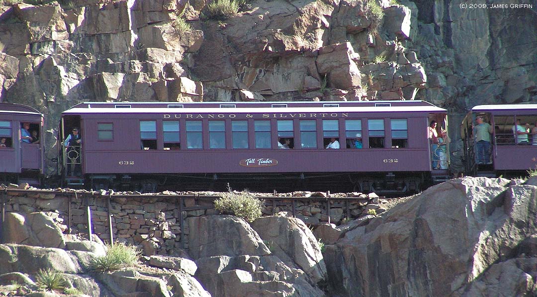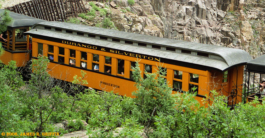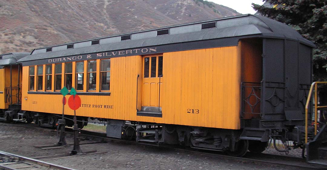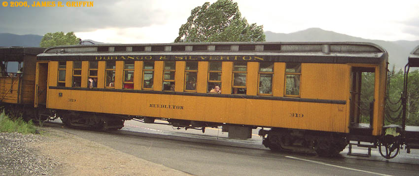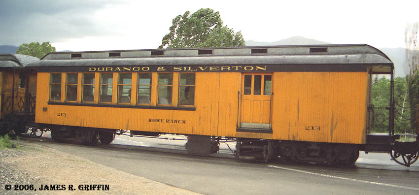 This car was built in 2006, but the design is based on the original car of the same name that ran dbetween 1947 and 1953, when it was tragically lost in a roundhouse fire in Alamosa. Note the flying lettering. |