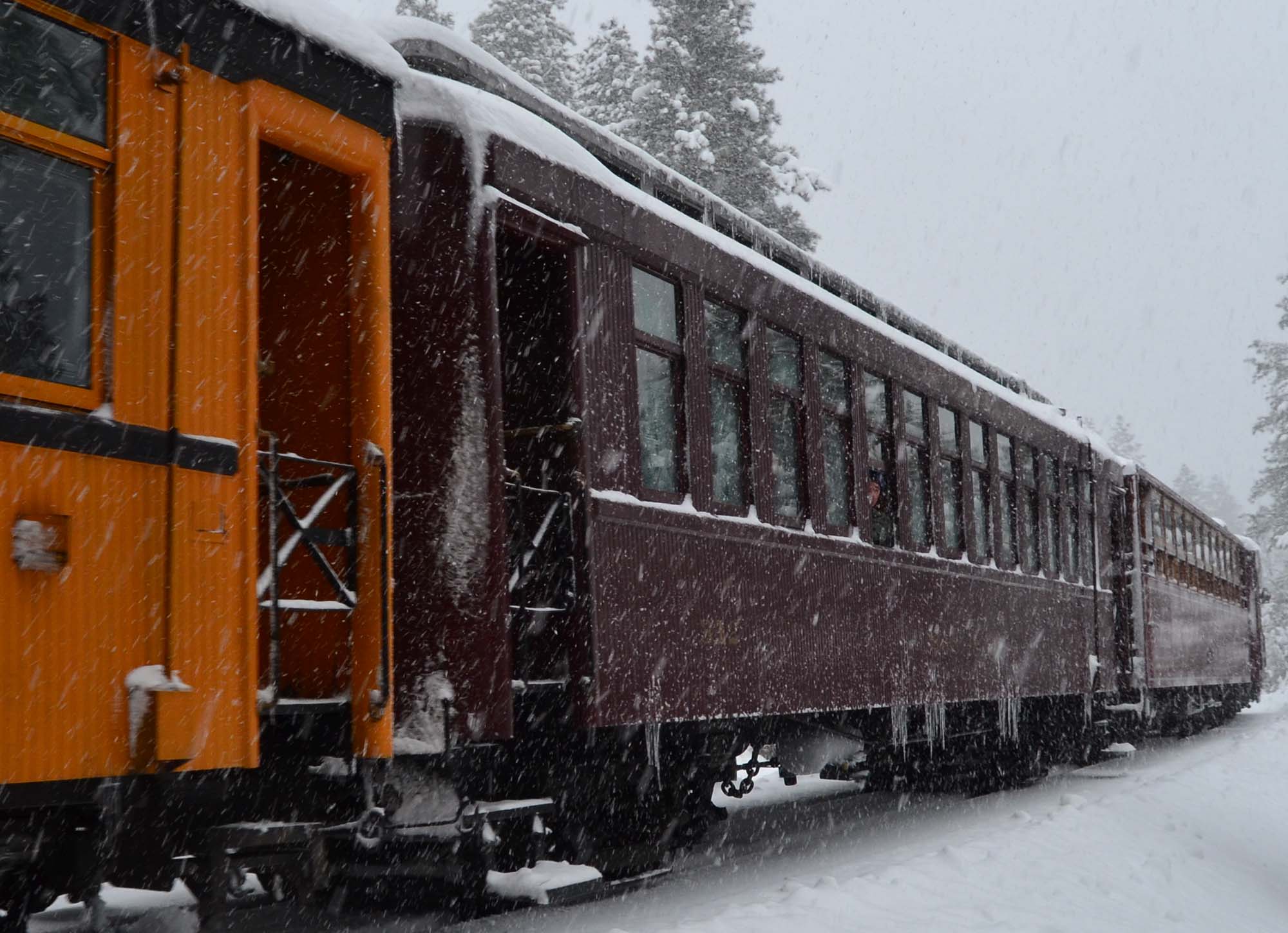 Car 312, “SAN JUAN“, approaching the 550 overpass on a snowy December day in 2015. |