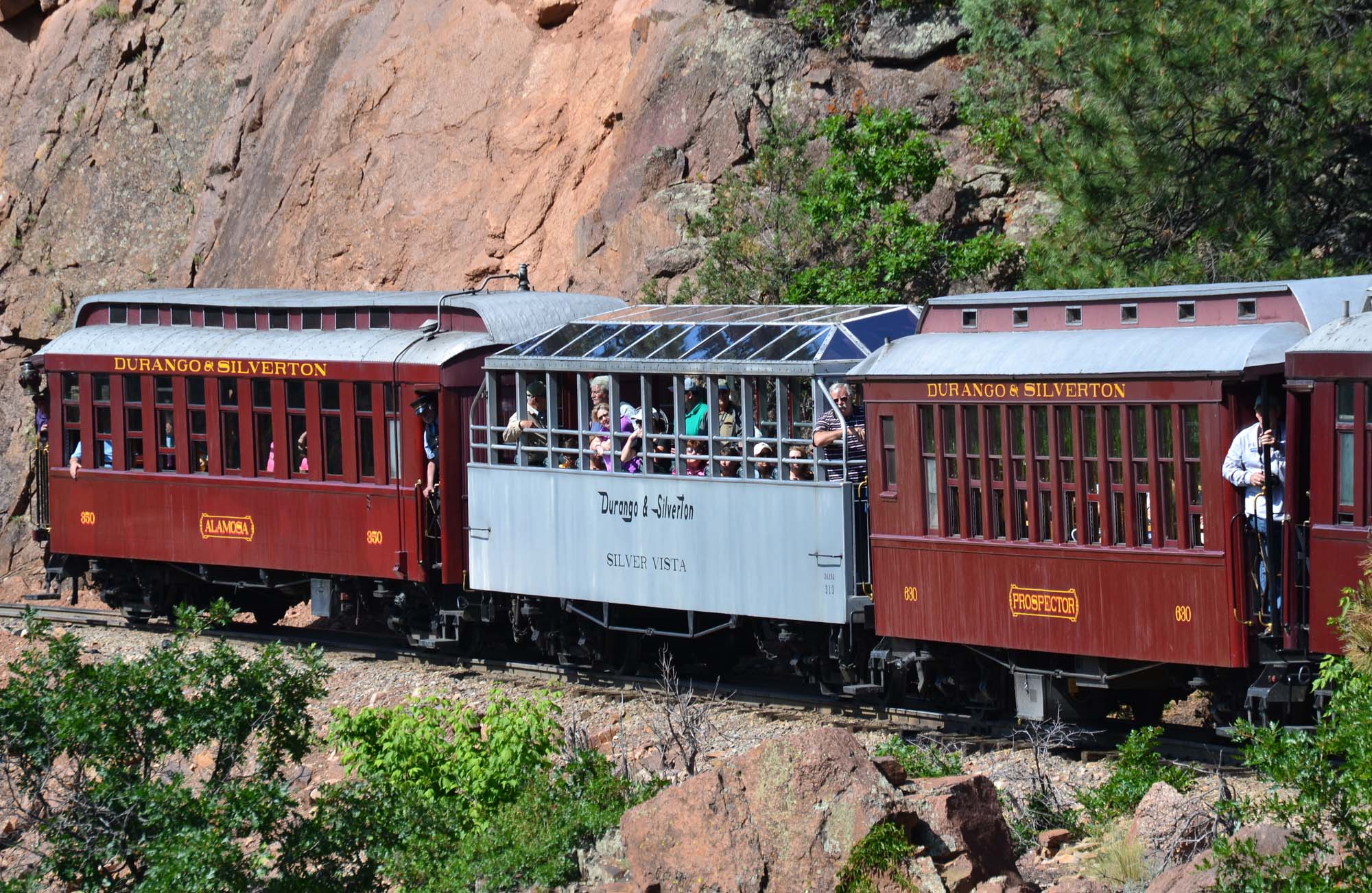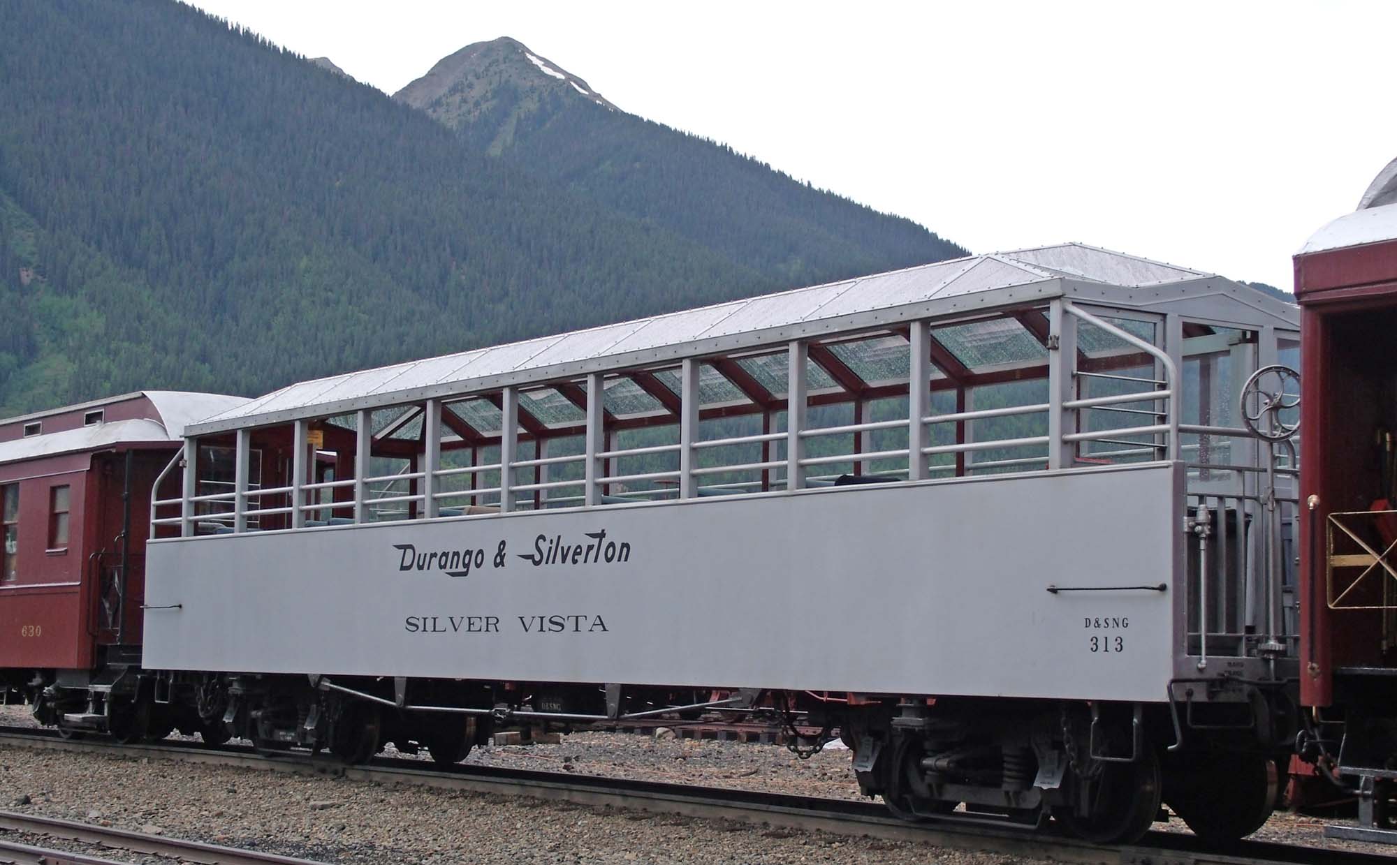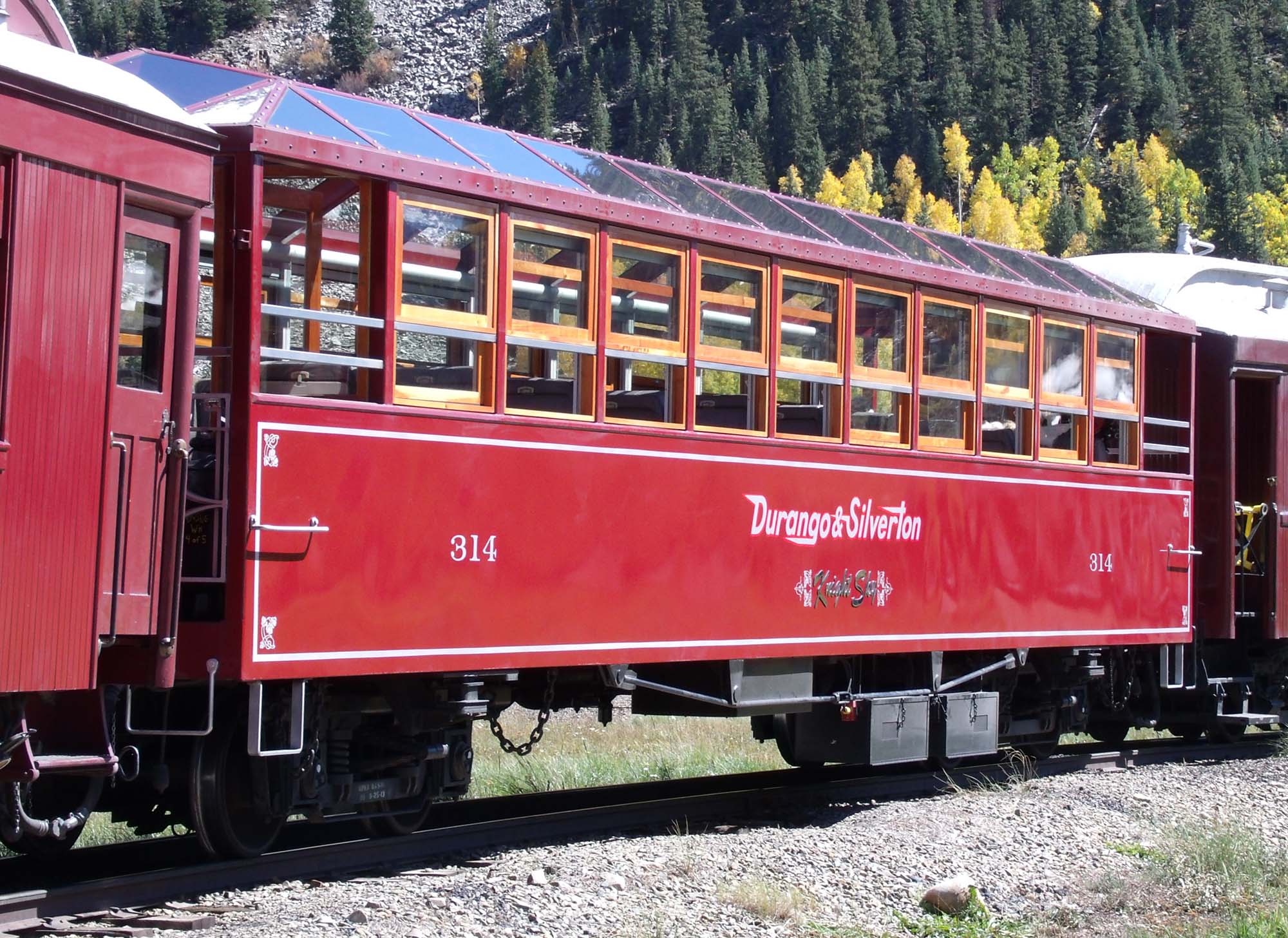 Gondola Observation No. 314, aka KNIGHT SKY. Built by the D&SNG in early 2012 with a strong resemblance to the Silver Vista, this car is equipped with removable windows (installed during fall and winter so it can be enclosed in cold weather). |