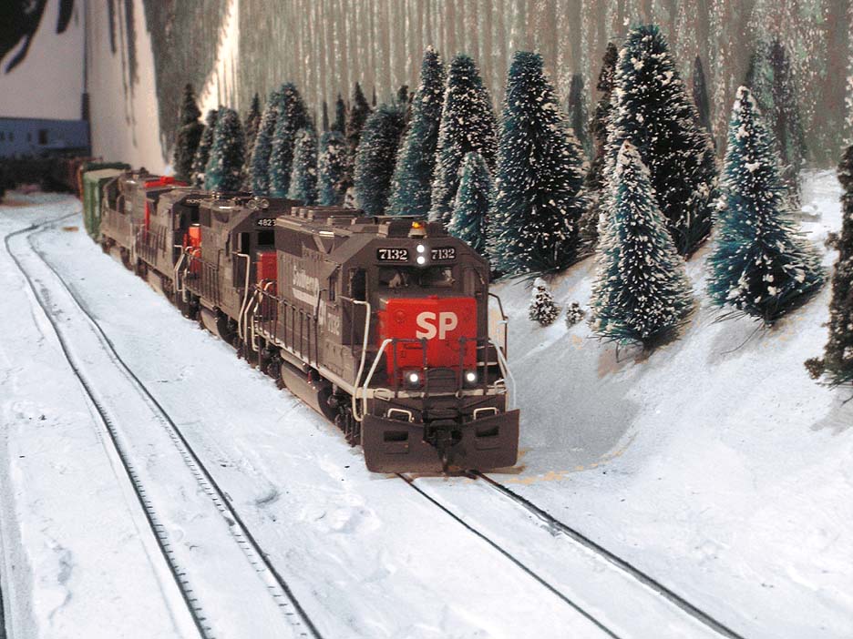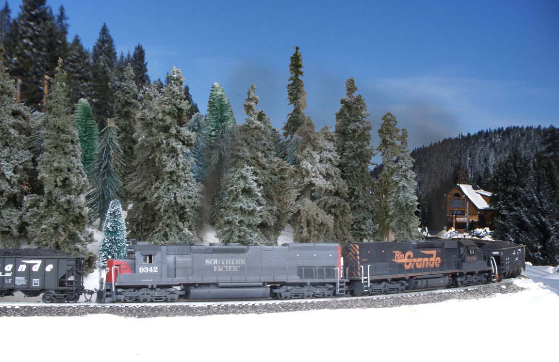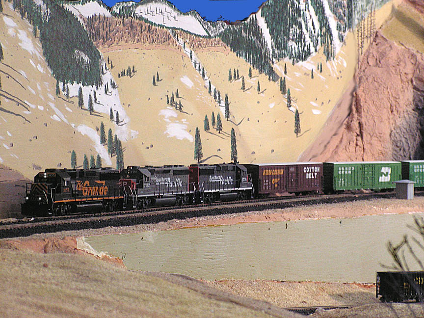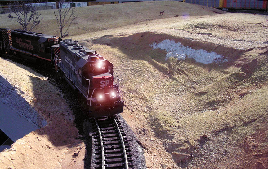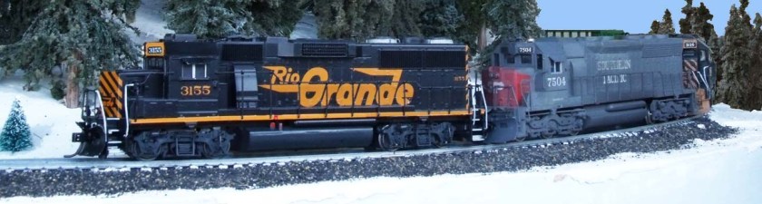 The SD45T-2 is an off-the-shelf Athearn SD45T-2 which I repainted Espee and weathered heavily, and a blue-box Athearn D&RGW SD40T-2 which received an extensive detailing (including milling the fuel tank to correct size). |