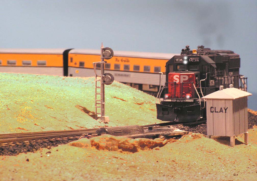 Another hour and we find it entering the Big 10 curves, passing the east switch of Clay siding Note the signal shack andsignal. I’ve scratch-built several of these sheds, a common type of structure in this area. (backdrop has since been completed) |