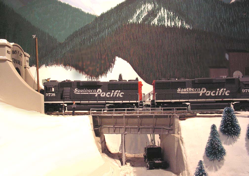 The closest thing to a hotshot train on the SP, the DVROT (Denver-Roper Trailers) train coasts down pasts Winter Park siding after exiting the Moffat. The three GP60s are in dedicated service between Denver and Salt Lake City. |