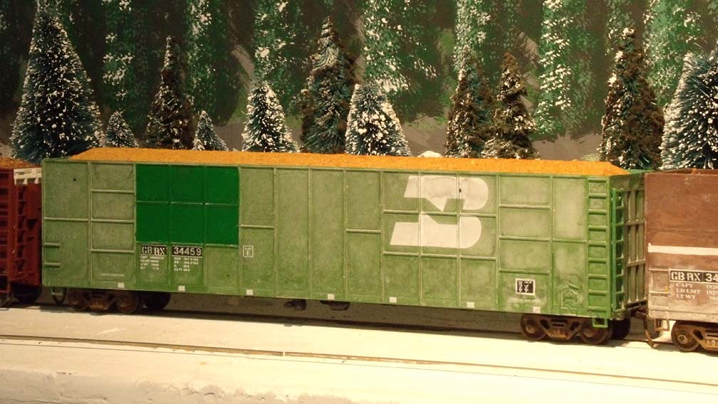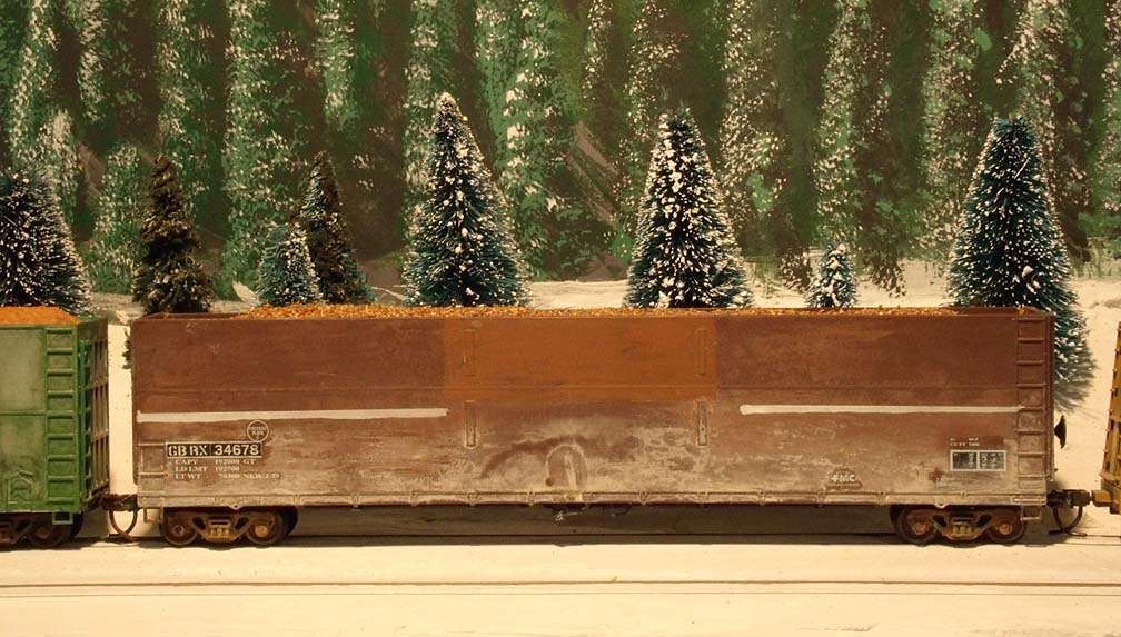 Something different: a second-hand woodchip gondola, formerly BN and now owned by Greenbrier Leasing, numbered GBRX 34459. The oxidizing is severe on these old cars. See here for a view of the prototypes. I had fun experimenting with the weathering process. |