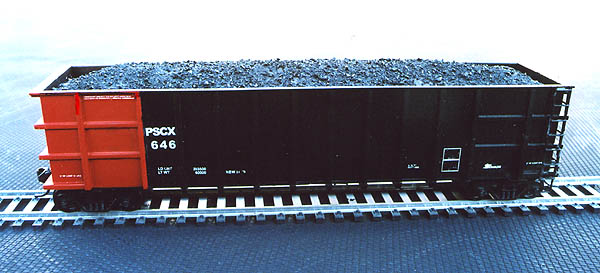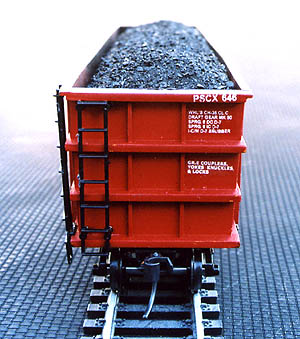Here’s a Thrall coal gondola from Roundhouse, lettered for PSCX. I created the artwork for the decals and had them custom-printed. The coal load is also homemade, using real coal. I did these cars before the factory-lettered cars were available. I’m also modifying some Walthers Bethgons for the same purpose. |