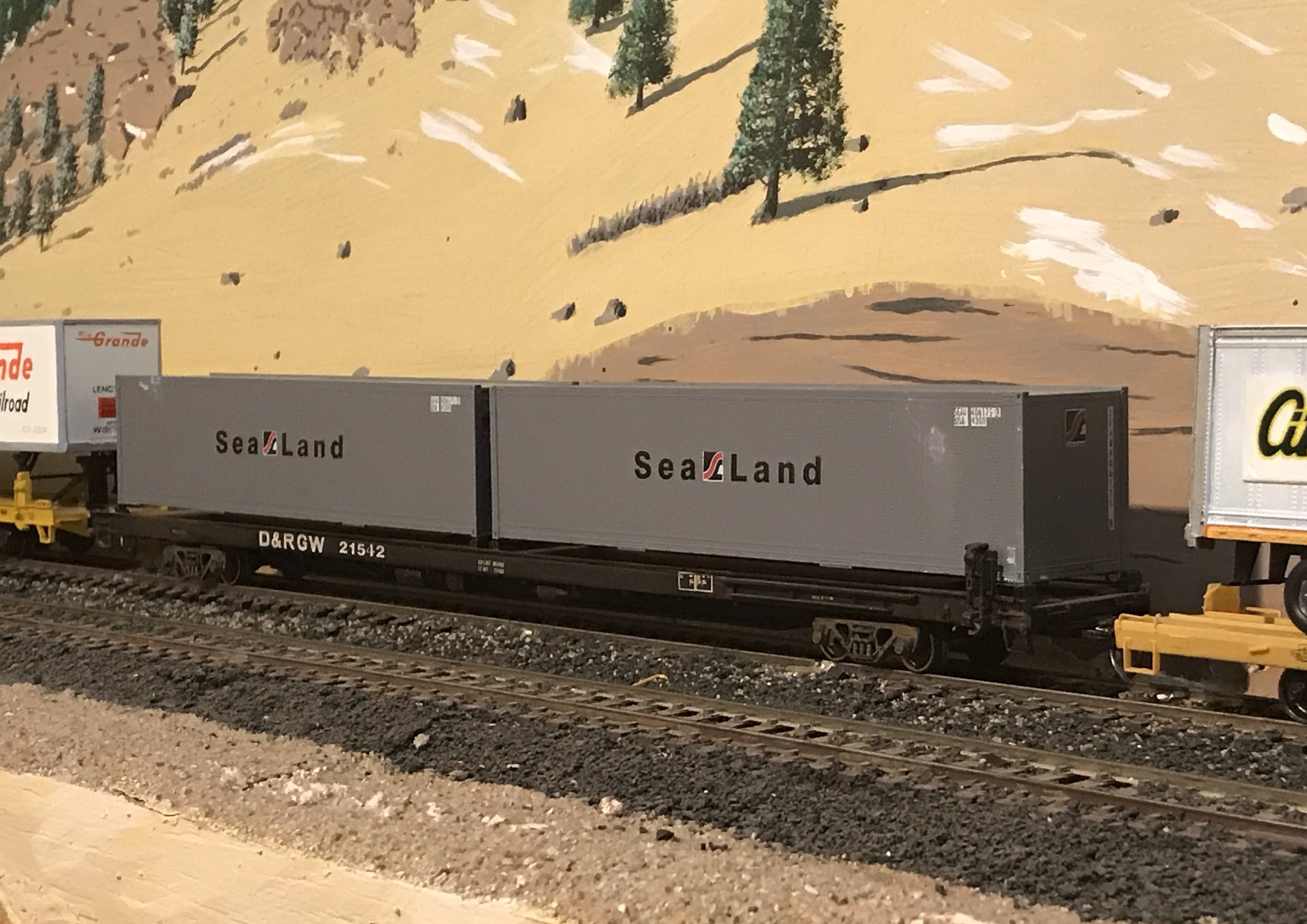 Intermodal traffic was important on the Moffat prior to the UP merger. Here is one of Rio Grande’s cars from the 1960s, converted to container service. The model is an Athearn 86′ flatcar which is a perfect match for these cars. I repainted it and lettered it, after adding container pedestals. NEW IMAGE |