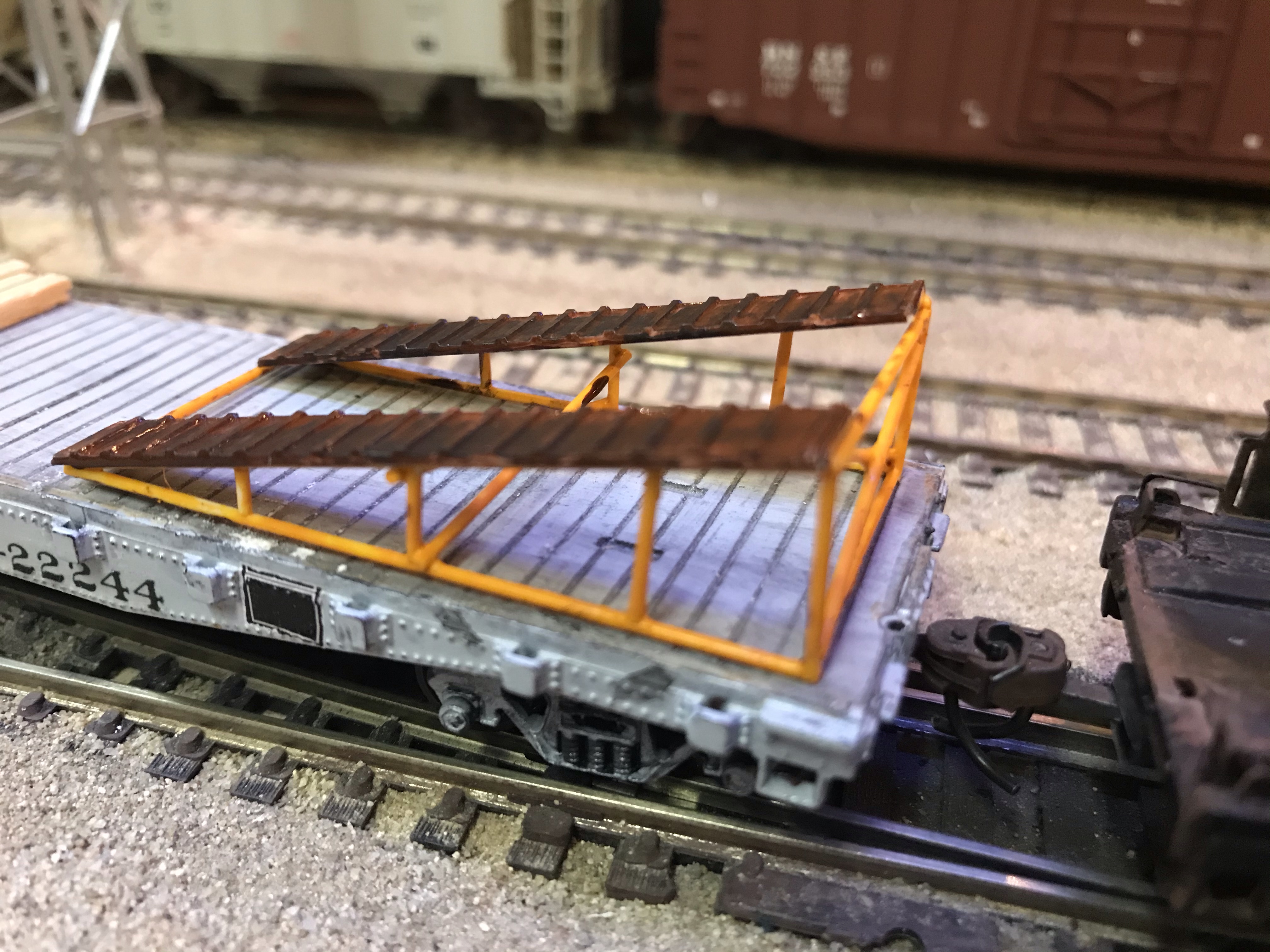 The foobie flatcar I mentioned above is shown here with a portable ramp used for getting tracked equipment on and off of flatcars. The ramp is copied from the real ones the D&RGW used for its small fleet of side-boom dozers.NEW IMAGE |