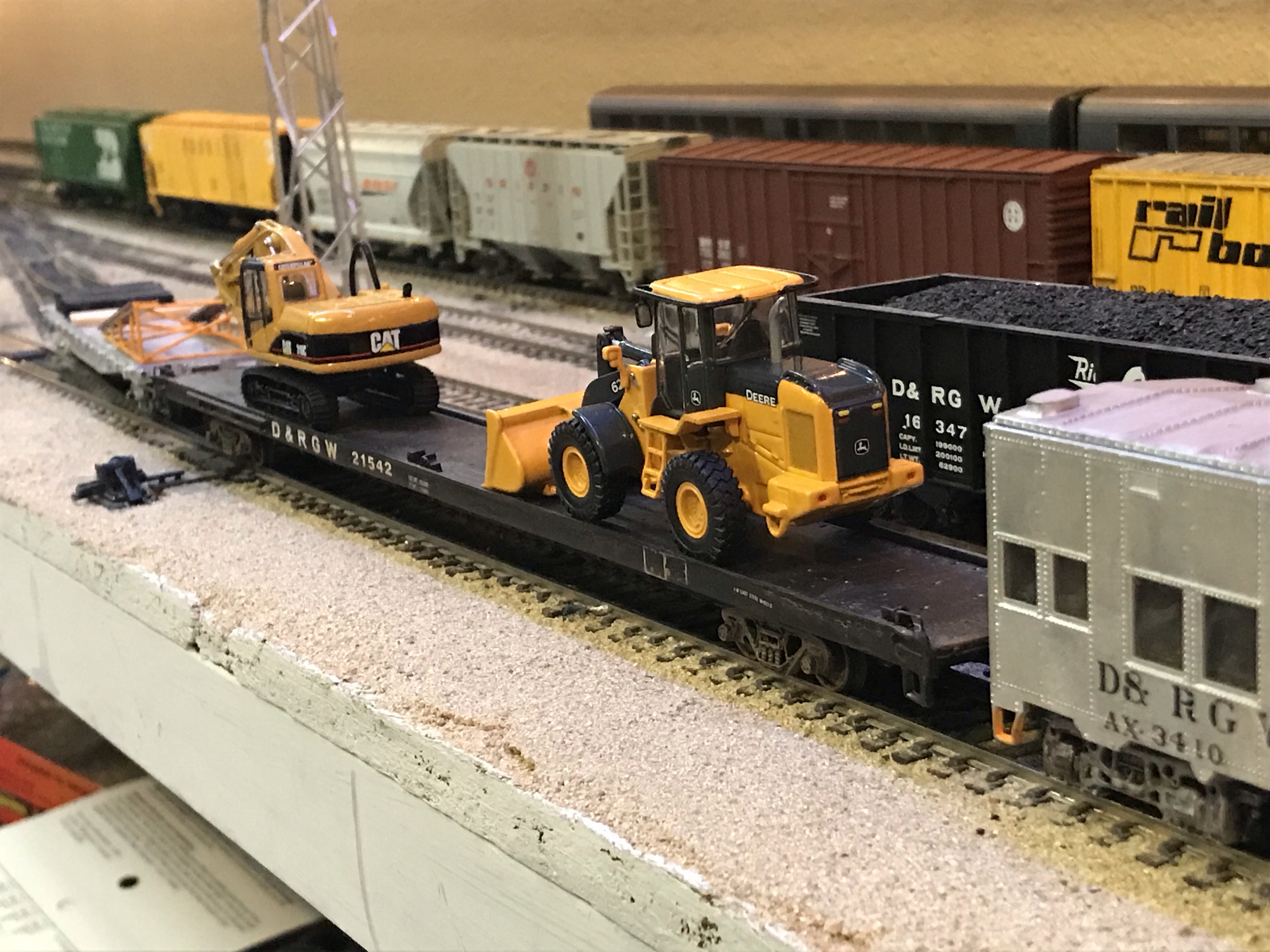 I have two 86′ flatcars that the Rio Grande acquired in the ’60s for TOFC service. Later most were converted to COFC or maintenance-of-way or both. Here, one of them is carrying two off-track earthmovers for a contractor. It’s an older Athearn car that happens to be a perfect match.