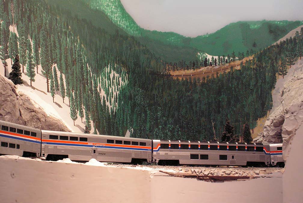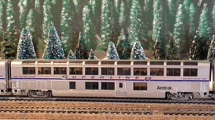 Amtrak has been running trains on this route since April 1983. I now have enough Superliner cars to operate an Amtrak California Zephyr, for any period up to the present. I have cars in Phase II, III, IV, and IVb schemes. I have painted and decaled several Walthers Superliner 2 cars. I also made the decals for an AHM baggage car and a Hi-Level transition Coach/Dorm. I added partitions to the sleepers so you can’t see clear through them, and built a full interior for my S2 Lounge (see below). And finally, I have created a few ad-wrap cars for the 2018 version of the Winter Park Express.