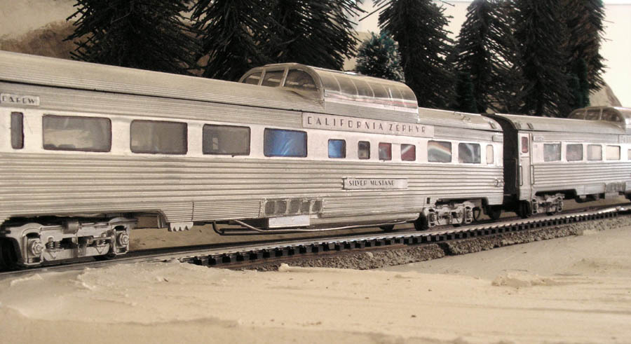 Two Con-Cor dome cars have been EXTENSIVELY reworked to have accurate windows, domes, and interiors. In this shot, the westbound CZ is at Hideaway park. Since the photo I have filled in the truck cutouts in the skirts on the MUSTANG, and body-mounted the draft gear. I had to add a ton of weight (scale tons, that is) to get it to operate with the far-heavier BLI cars. Even so it struggles, so this car is in semi-retirement in the display case. |