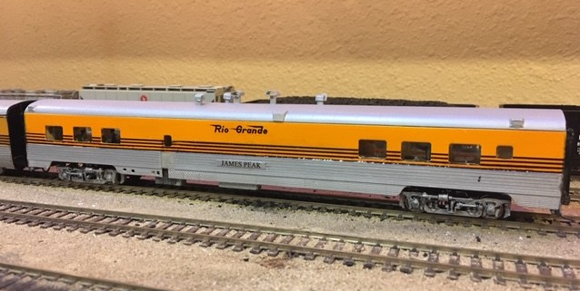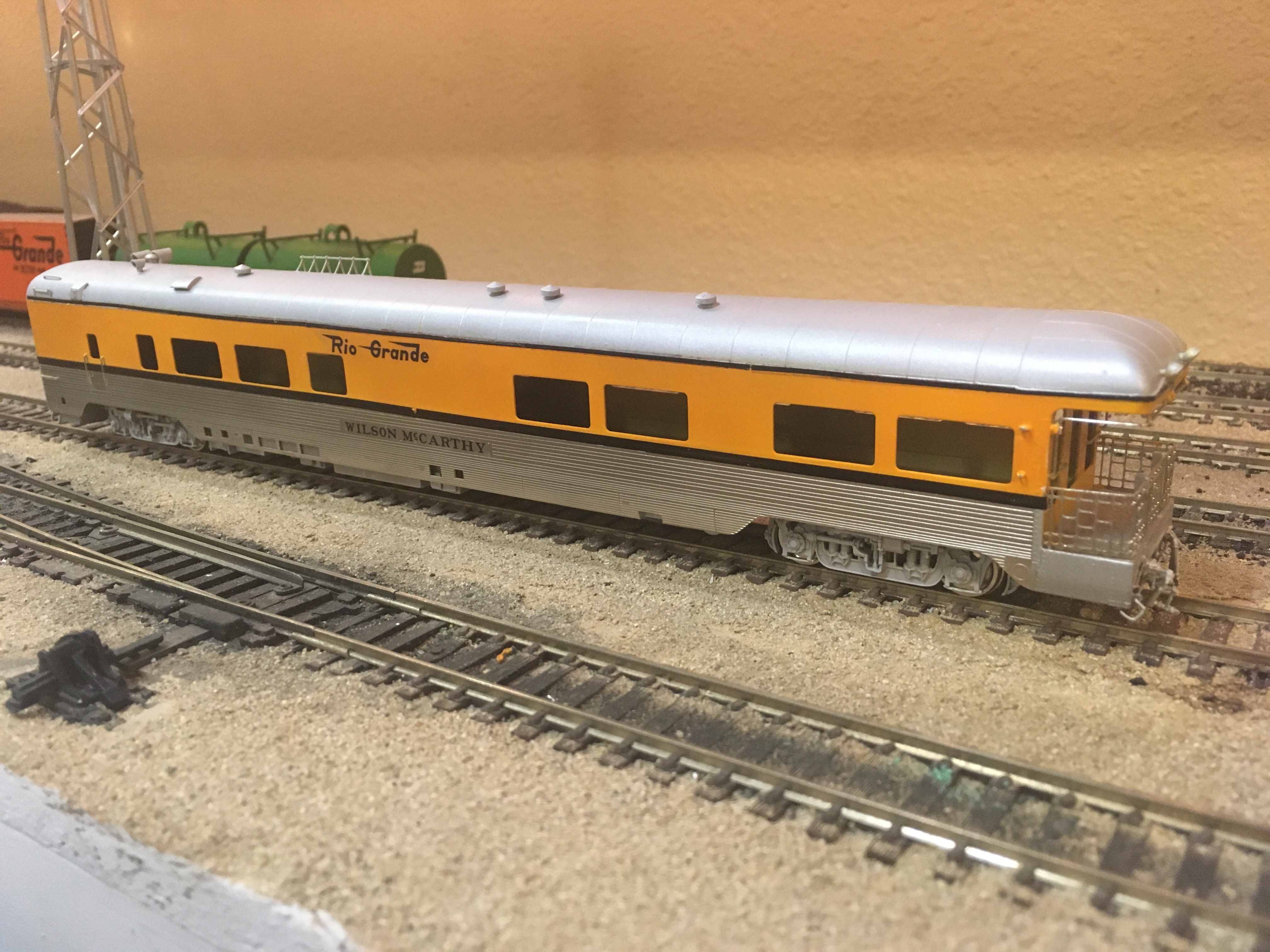Business Car Wilson McCarthy, a brass car which I had sandblasted and then painted and lettered. This car often showed up on the rear of the Rio Grande Zephyr. Later it was modified mechanically for modern operations and renamed “KANSAS”, and as such was a fixture on the modern Ski Train. I, however, do not plan on relettering it for each new era! |