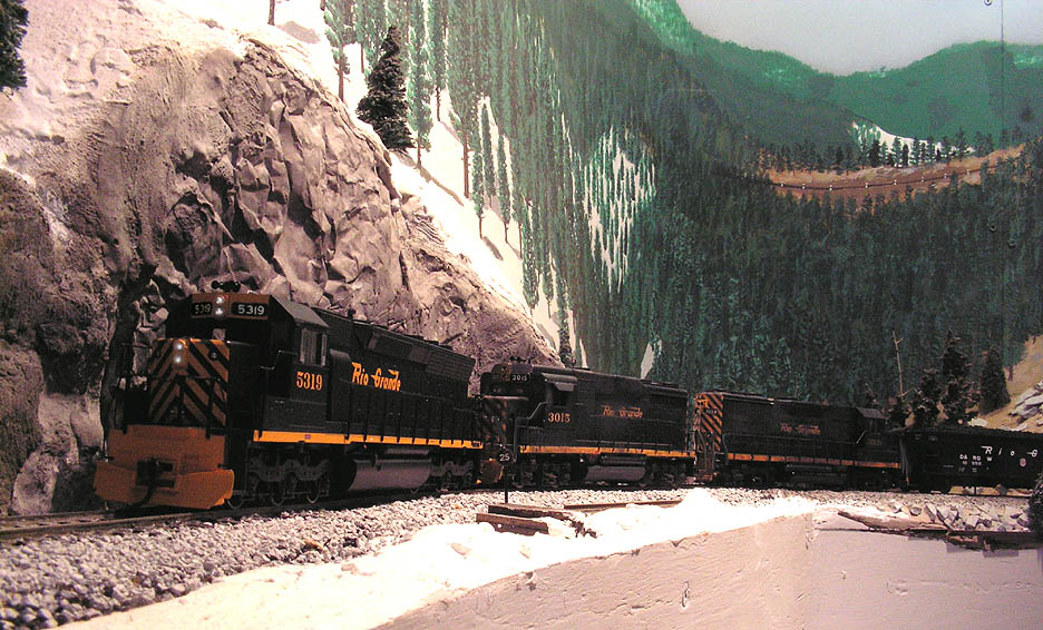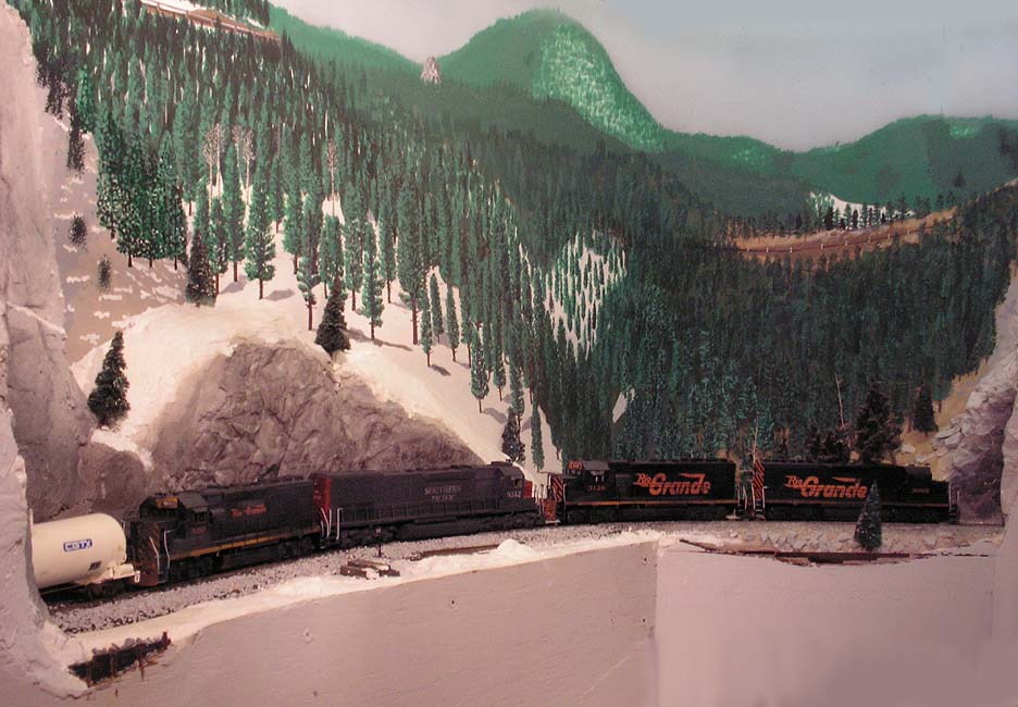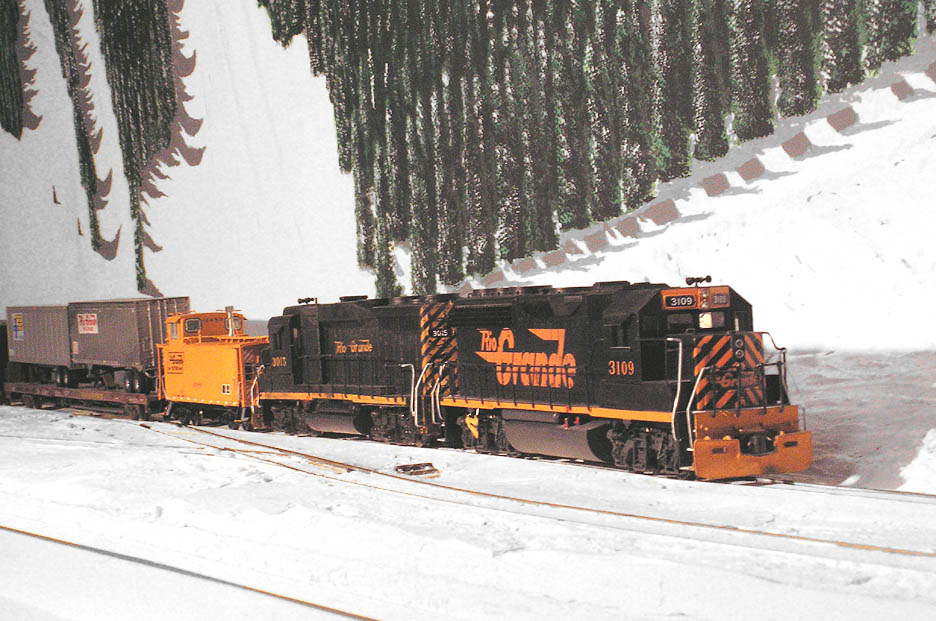 1992. A pair of 6-axle home-road units are working as the swing helper on a coal train approaching West Portal. This is in January. A couple of months later, the decision was made to emphasize the SP brand, which included a new, fully-integrated operating philosophy. Solid sets of Rio Grande power became a thing of the past.