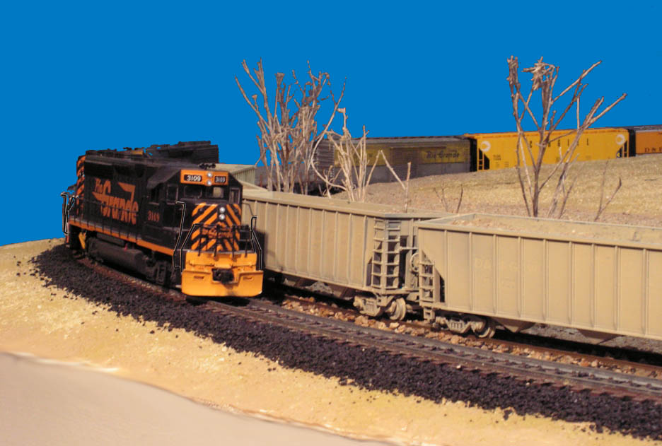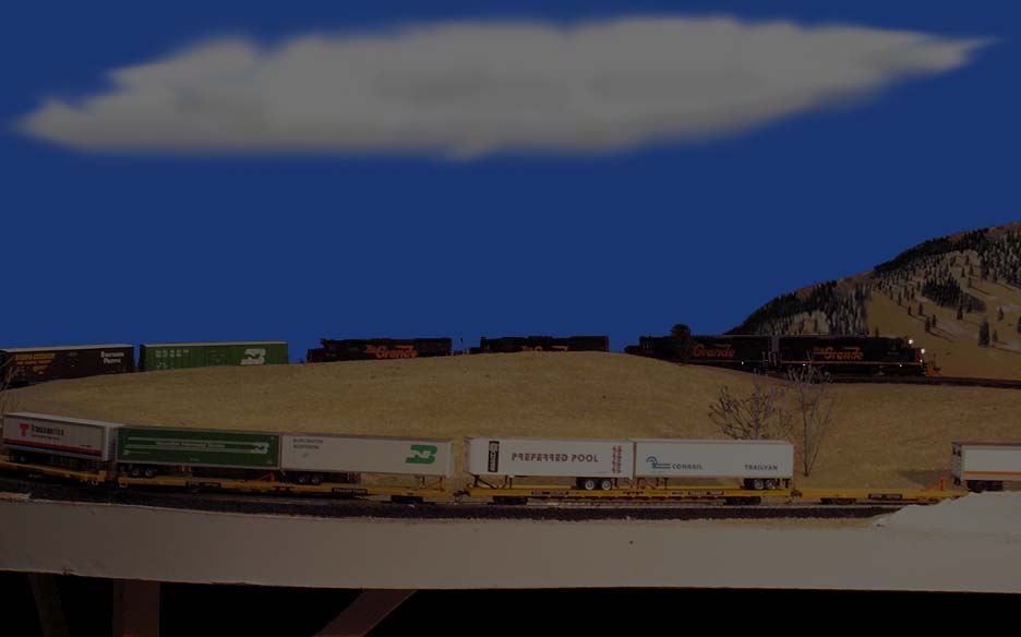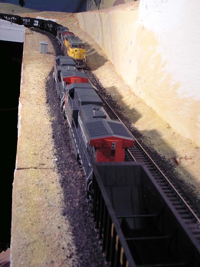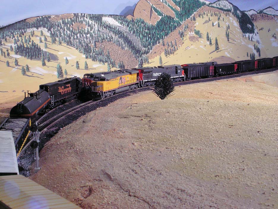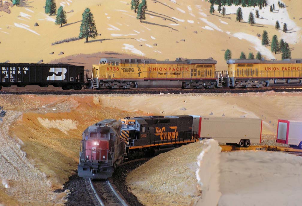 2000. UP was running a daily ZDVRO / ZRODV pair of intermodal trains, mostly with UPS trailers. The train often pulled older SP and D&RGW units for power. For one thing, they were low-utilization (i.e. available), and UP was trying to run hours off of them so they could be returned to the lessors. Here the ZDVRO is rounding Little 10, as a coal train waits in Clay siding above. An SP SD45R and a D&RGW tunnel motor lead the ZDVRO. (See here for a similar, real-life example) |