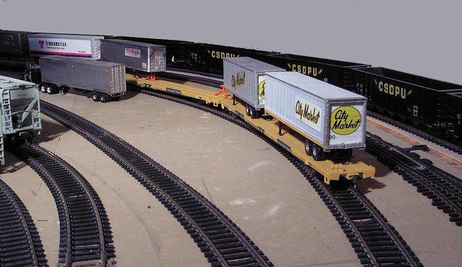 1979. At the piggyback track at North yard, City Market trailers have been loaded for the overnight trip to Grand Junction. Another van is being positioned for loading. This is the era of 40-foot trailers. (Since this photo, the area has been ballasted.) |