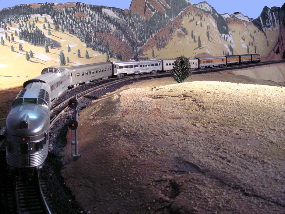 1964. The Prospector, D&RGW’s overnight train between Denver and Salt Lake, descends the front range just after sunrise. Note the piggyback car behind the lounge. |