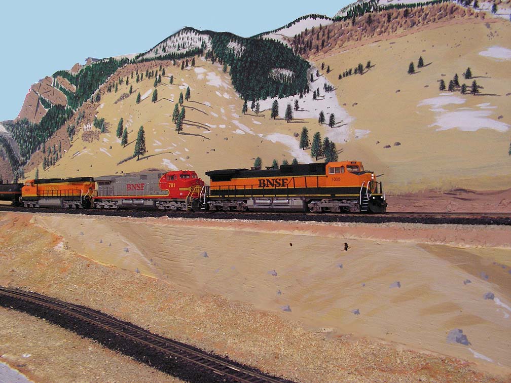 2003. A typical 2-unit swing remote helper (both UP C44AC’s) is shoving in the middle of a coal train on the grade up to the west portal of Moffat Tunnel. It’s sunset in the Rockies. |