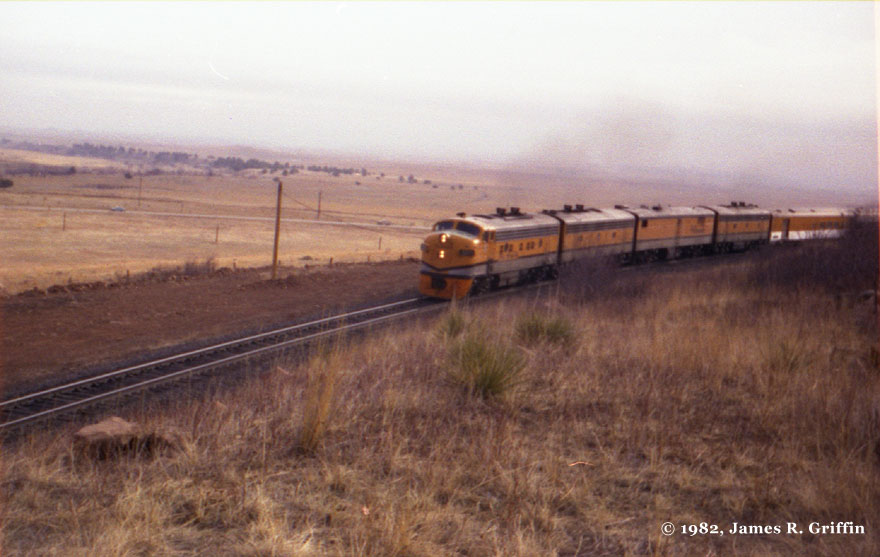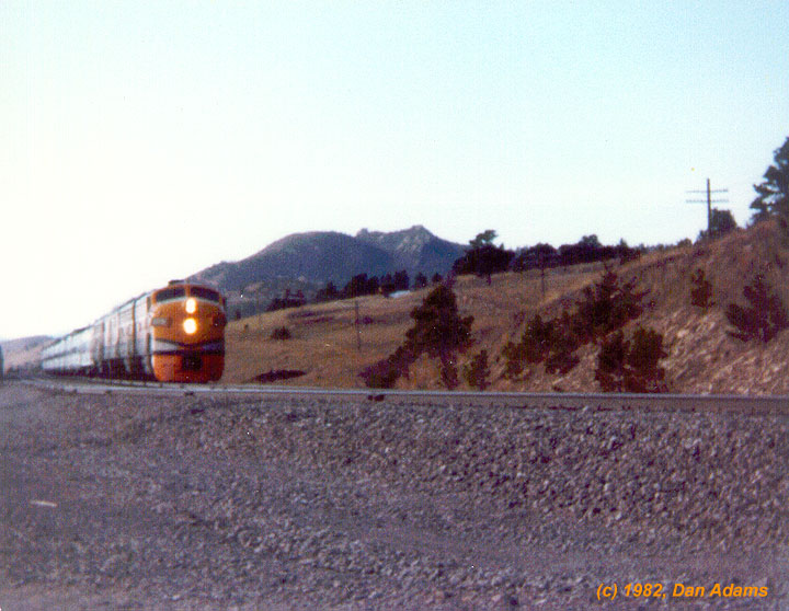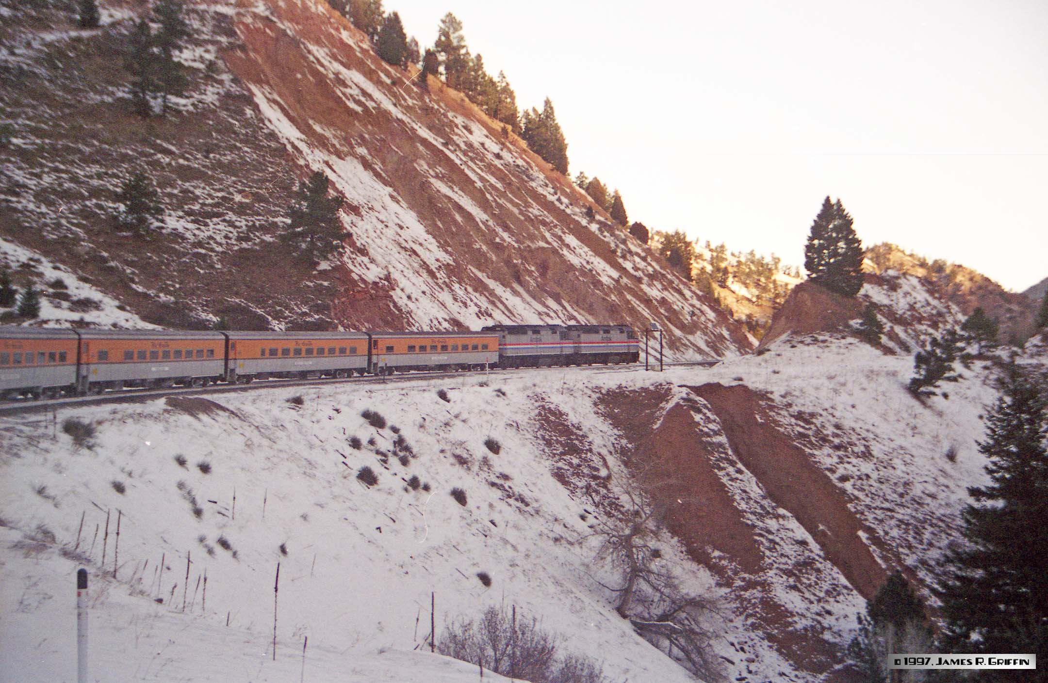 In 1983, Amtrak took over the route of the Rio Grande Zephyr, rerouting its erstwhile San Francisco Zephyr from Wyoming to the D&RGW’s Denver-Salt Lake line (and then renaming the train by co-opting the old California Zephyr‘s moniker). Here it is, not quite a year after the operation began, approaching Coal Creek bridge. It’s a long train; east of Salt Lake it’s the combined CZ / Pioneer / Desert Wind. (3/31/1984- and incidentally the very first frame I shot with my new Minolta) | ||