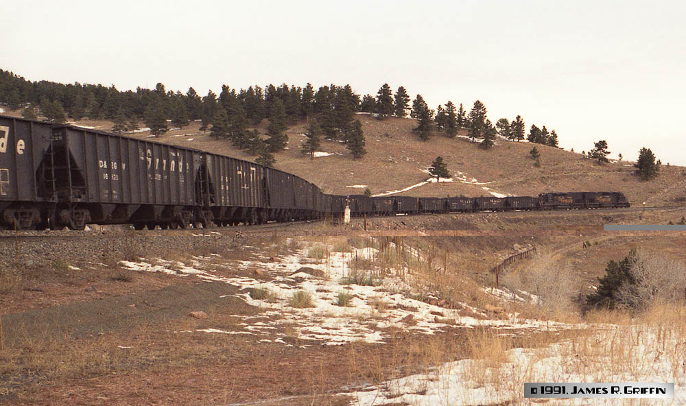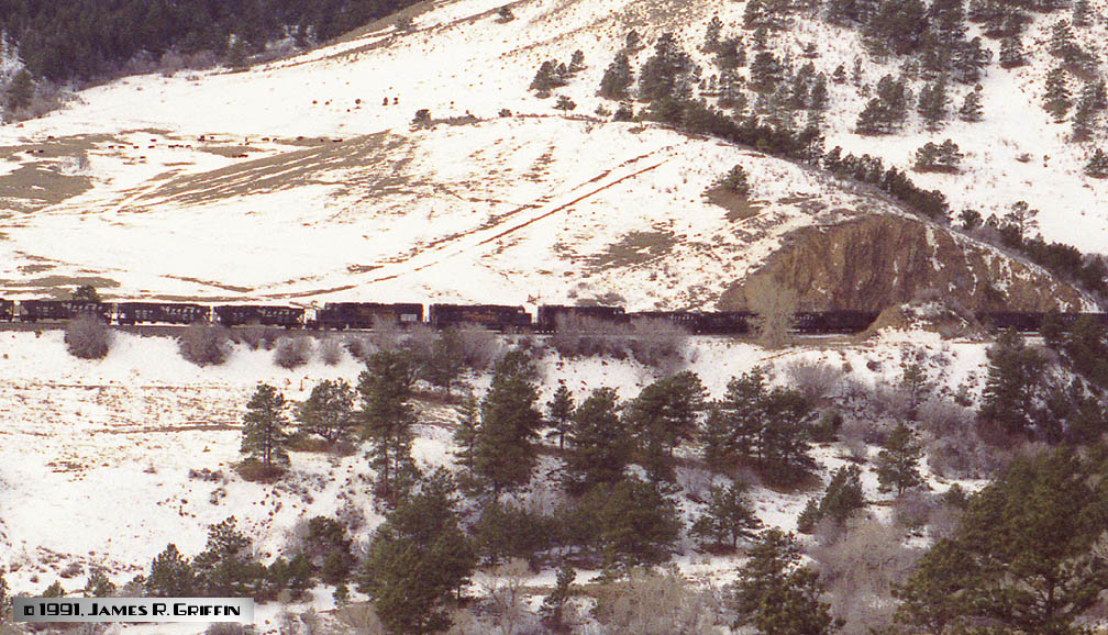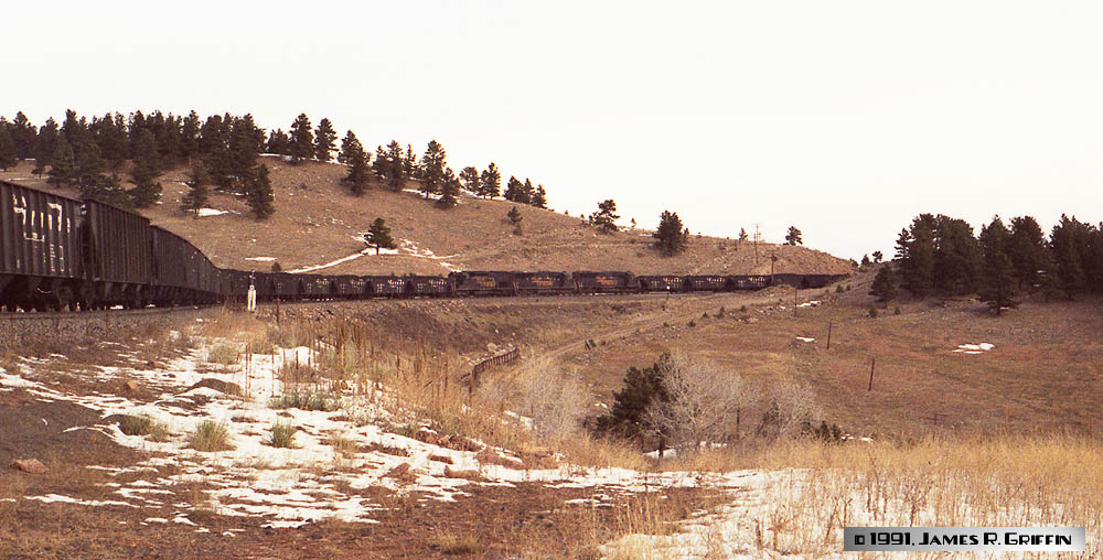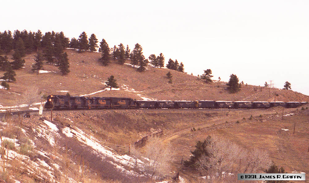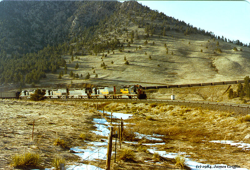 April 8th, 1984 finds an eastbound CSUX (Colorado Springs Department of Public Utilities) coal train descending from tunnel 1. This afternoon’s train has five units up front and another pair behind the caboose. This 73-car train (plus caboose) is trying to stay ahead of the returning Ski Train. I suspect it halted at Leyden to let the passenger train pass. | ||
