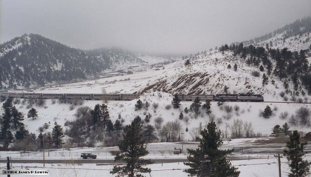 My first “railfan” photo (i.e., going out specifically to photograph a train). The Rio Grande Zephyr rounds the curve between Clay siding and Blue Mountain Road in early January 1982.It was a short train that Saturday. Two of the dome coaches were loaned to the Ski Train (Mayor’s special) that was following 10 minutes behind. | ||